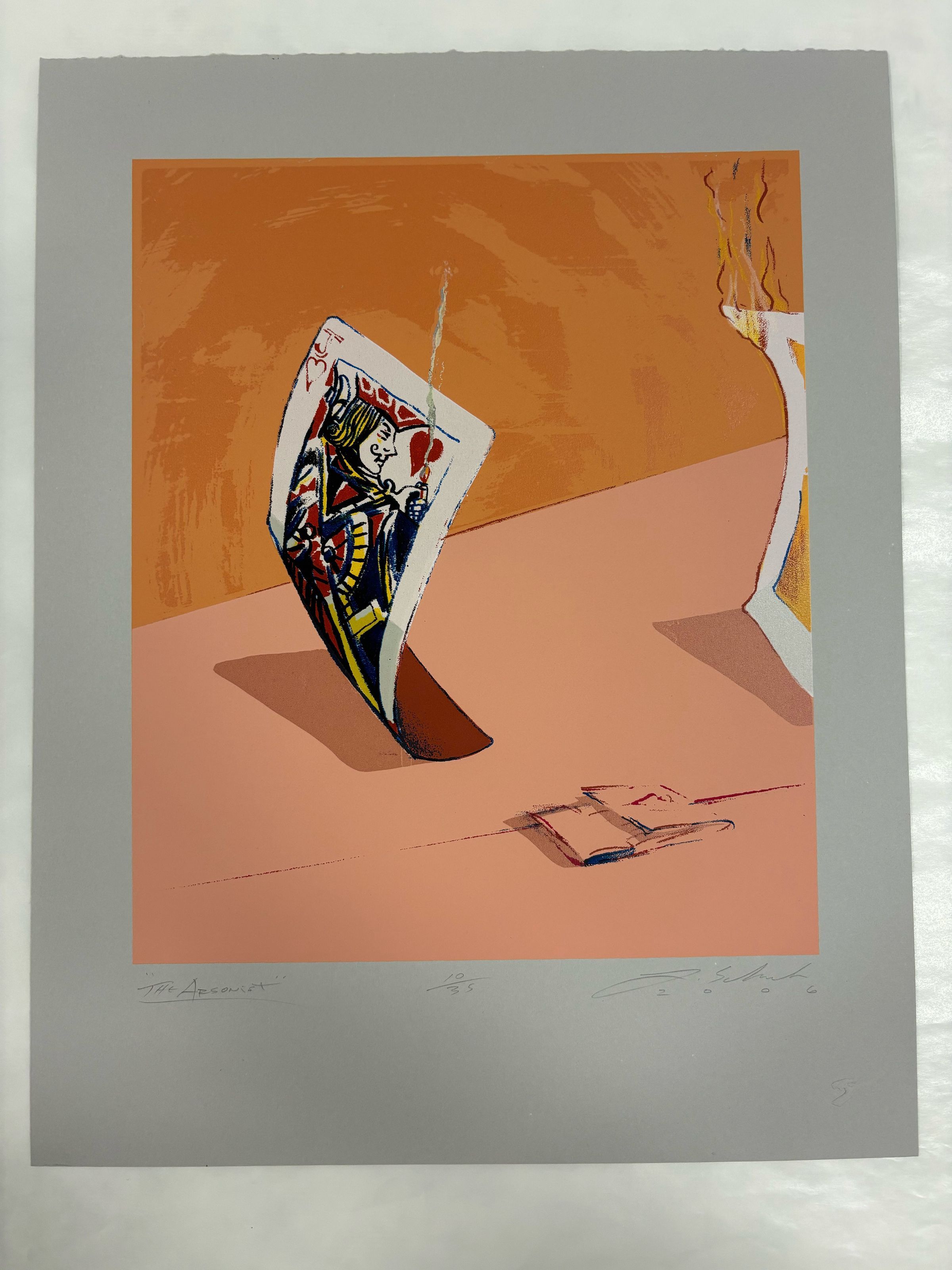 Medium, rectangular, vertically oriented print depicting two cards standing vertically facing each other. The card in the center features the Jack of Hearts lighting a candle and wisp of smoke can be seen coming out. A pack of matches are on the table.Collection