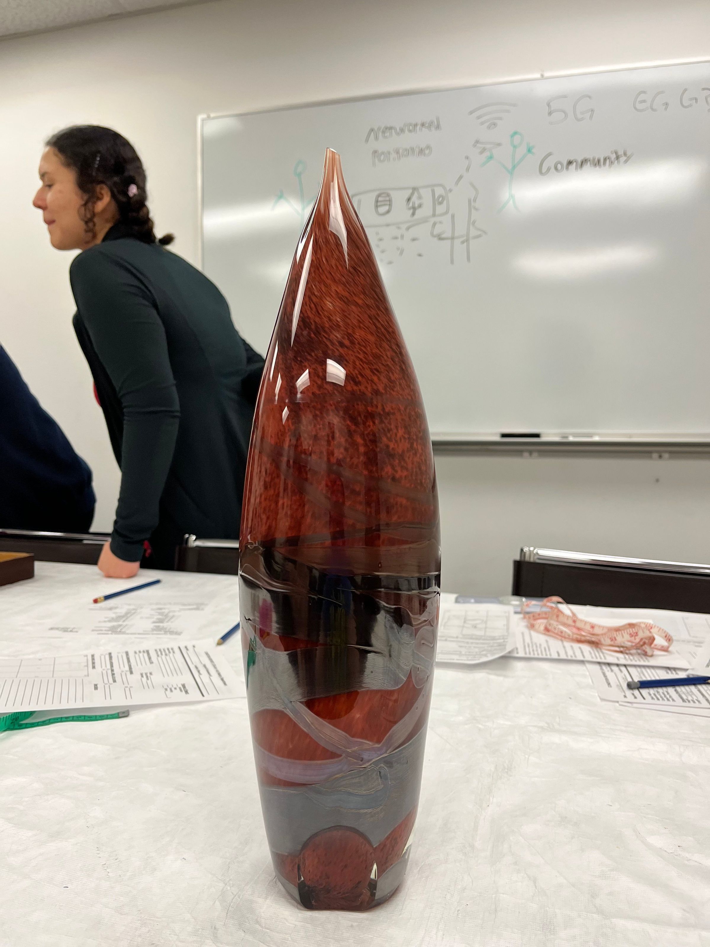 Almond shape, swirl, swirled, reduction, tall vase, lens, lensing, polished, speckled, wrap, body wrap, metallic, thick glass, clear glass, red glass, brown glass, white glass, gray glass, reactive, reaction