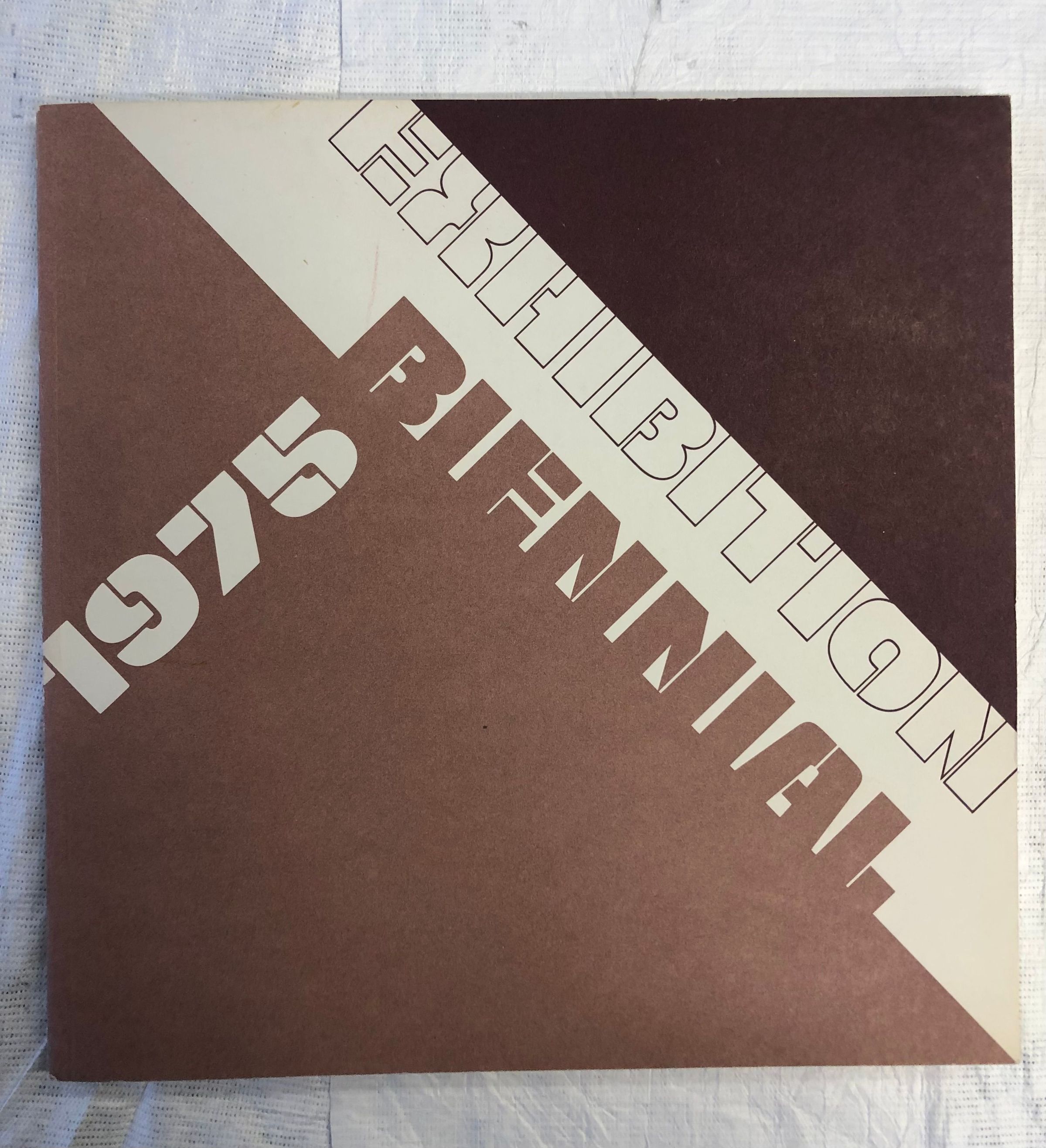 A medium sized, thin, brown and light brown book with a white stripe and lettering on the front and back cover. The interior contains an exhibition catalogue, with the images in black and white.Collection