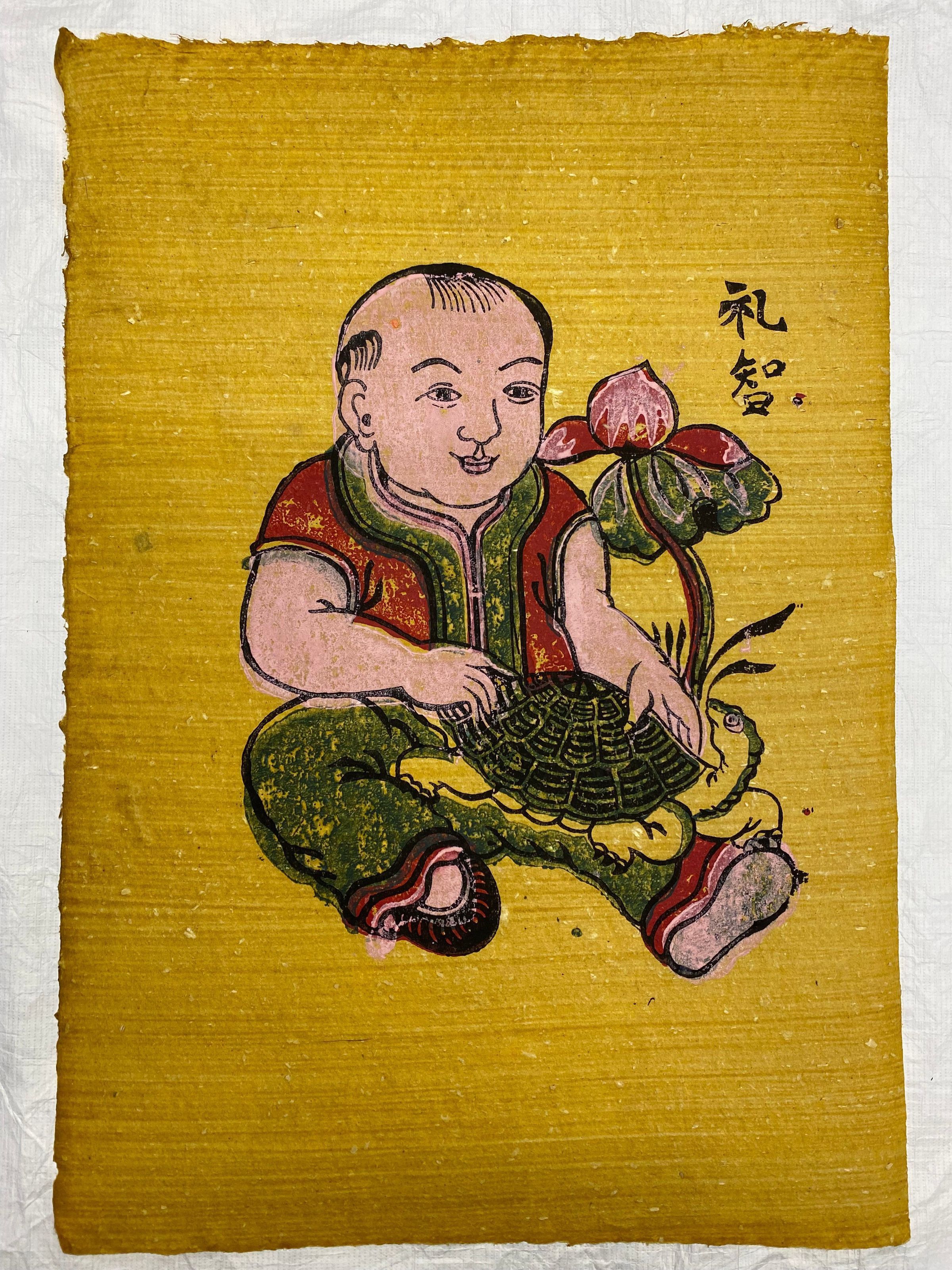 Traditional Vietnamese folk woodblock print on plant fibrous paper vertically depicts a baby-like form holding a turtle with a lotus flower and character on the left of the figure.Context