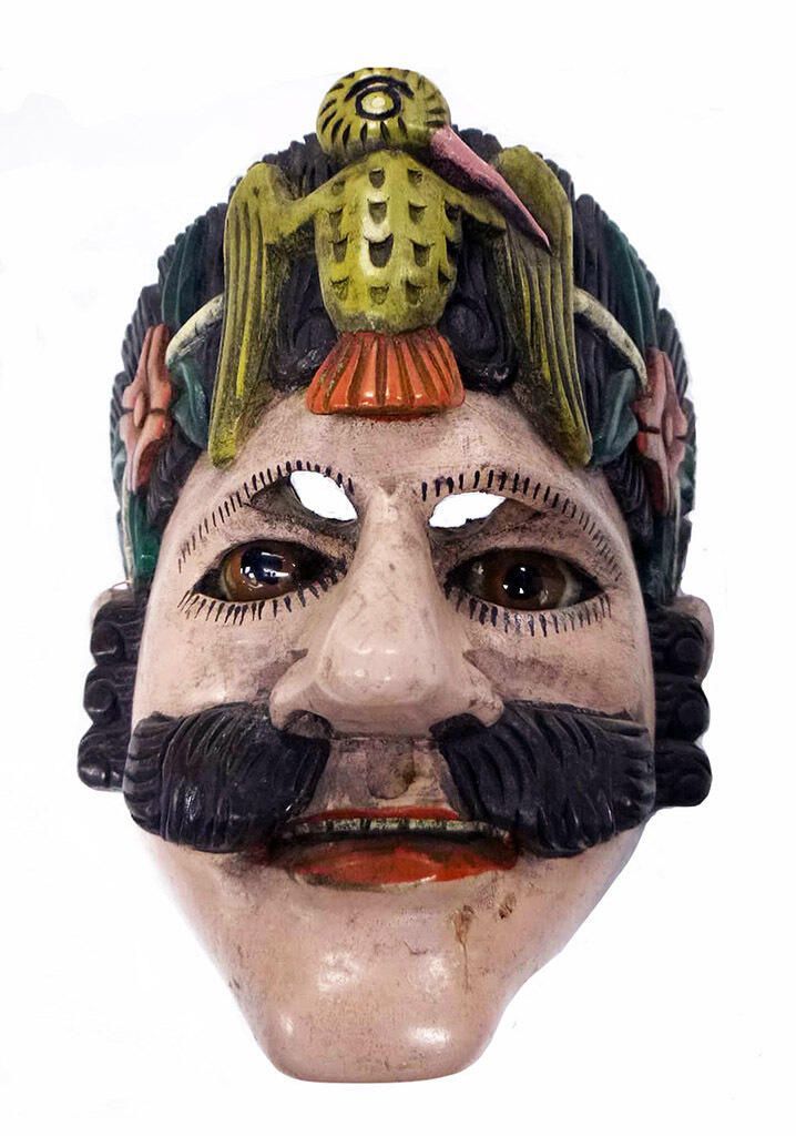 A life-sized round wood mask depicting a man with a pale ivory complexion. The mask has black carved hair that leads into curled sideburns. The hair is decorated with a large yellow bird and orange flowers. There are two cutout eyeholes for the wearer are above inset brown eyes. A large straight nose is above a parted black mustache and an open red mouth with white teeth. A wire is attached to the back of the mask. Some signs of pigment loss.Context