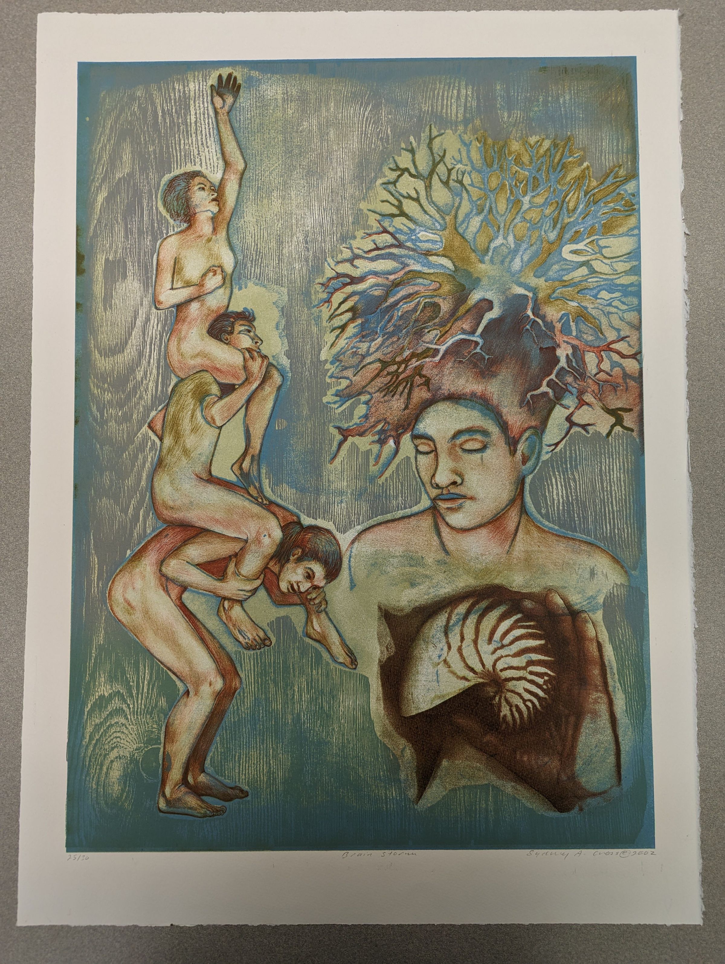 A large vertical print showing three nude figures on the left, stacked on top of each other & reaching upwards, with one figure on the right, who's holding a nautilus shell and whose head is bursting with a multicolored tree-like network of branches.Context