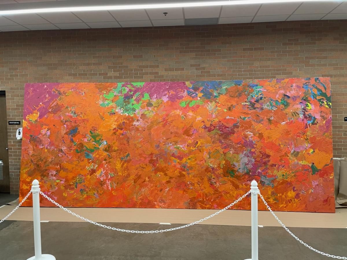 Extra large horizontally-oriented colorful abstract painting with orange, green, purple, red, and blue pigments.Collection