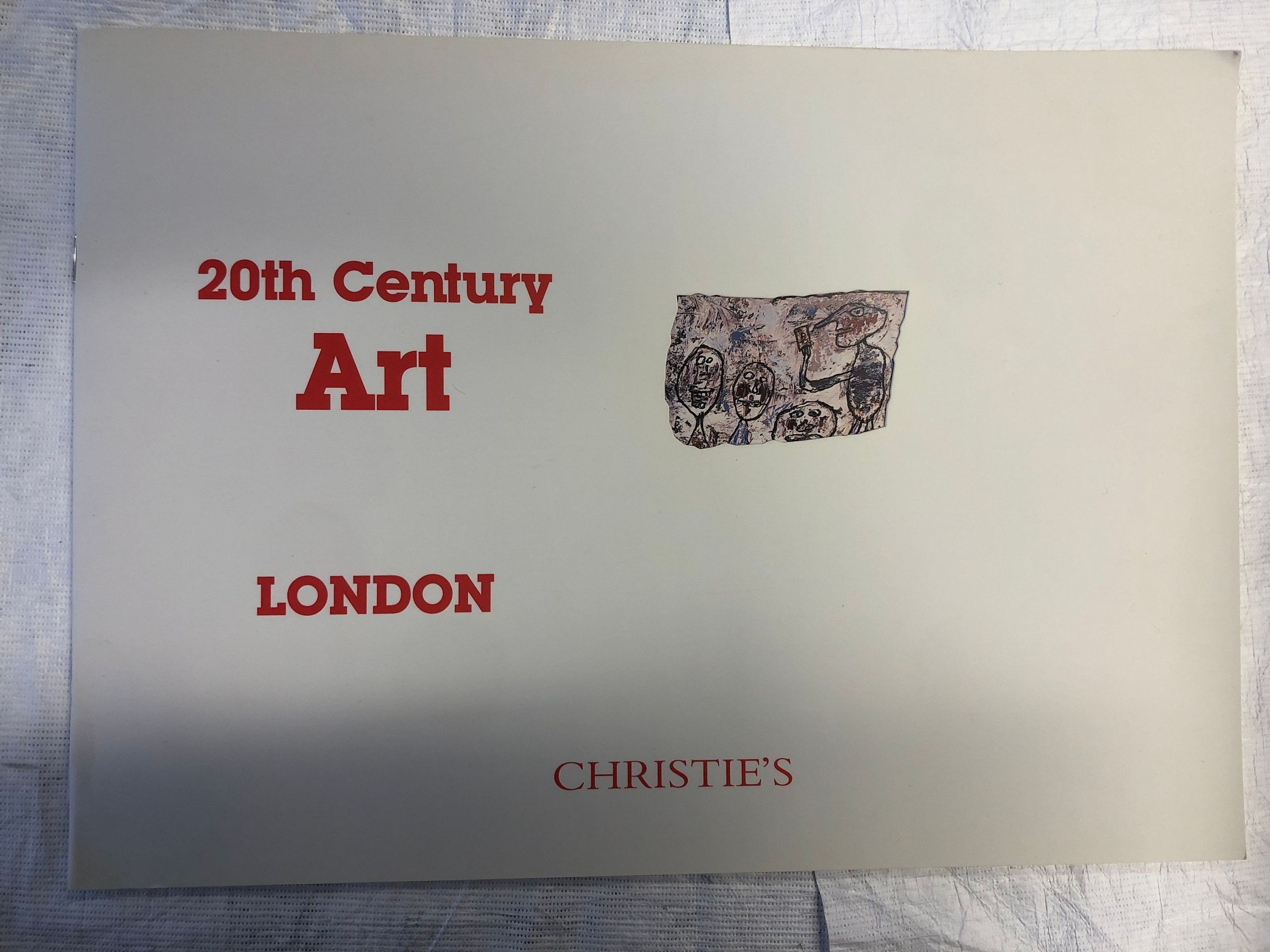 A medium, thin, white booklet with red lettering on the cover, as well as a cutout on the front to see the interior page. The interior contains an exhibition catalogue of artworks available at auction at the time of publication, images in color.Collection