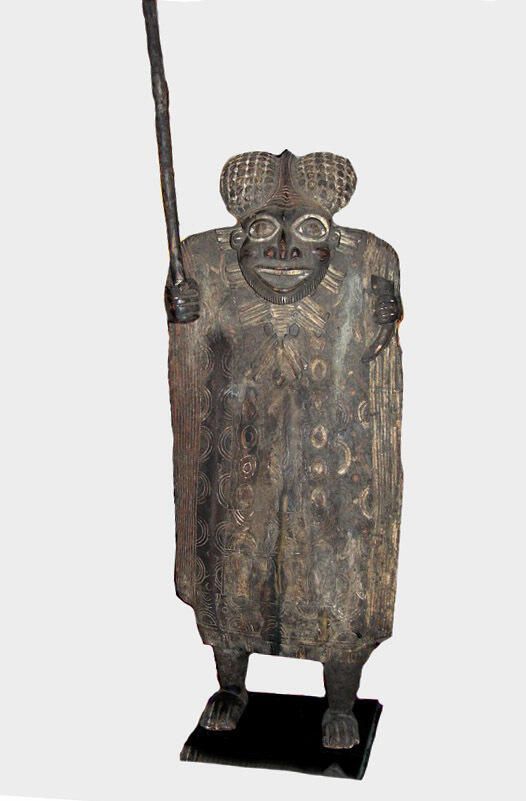 Large standing wood male figure with prominent eyes and mouth, elaborated crown, wearing incised tunic, and holding a spearCollection