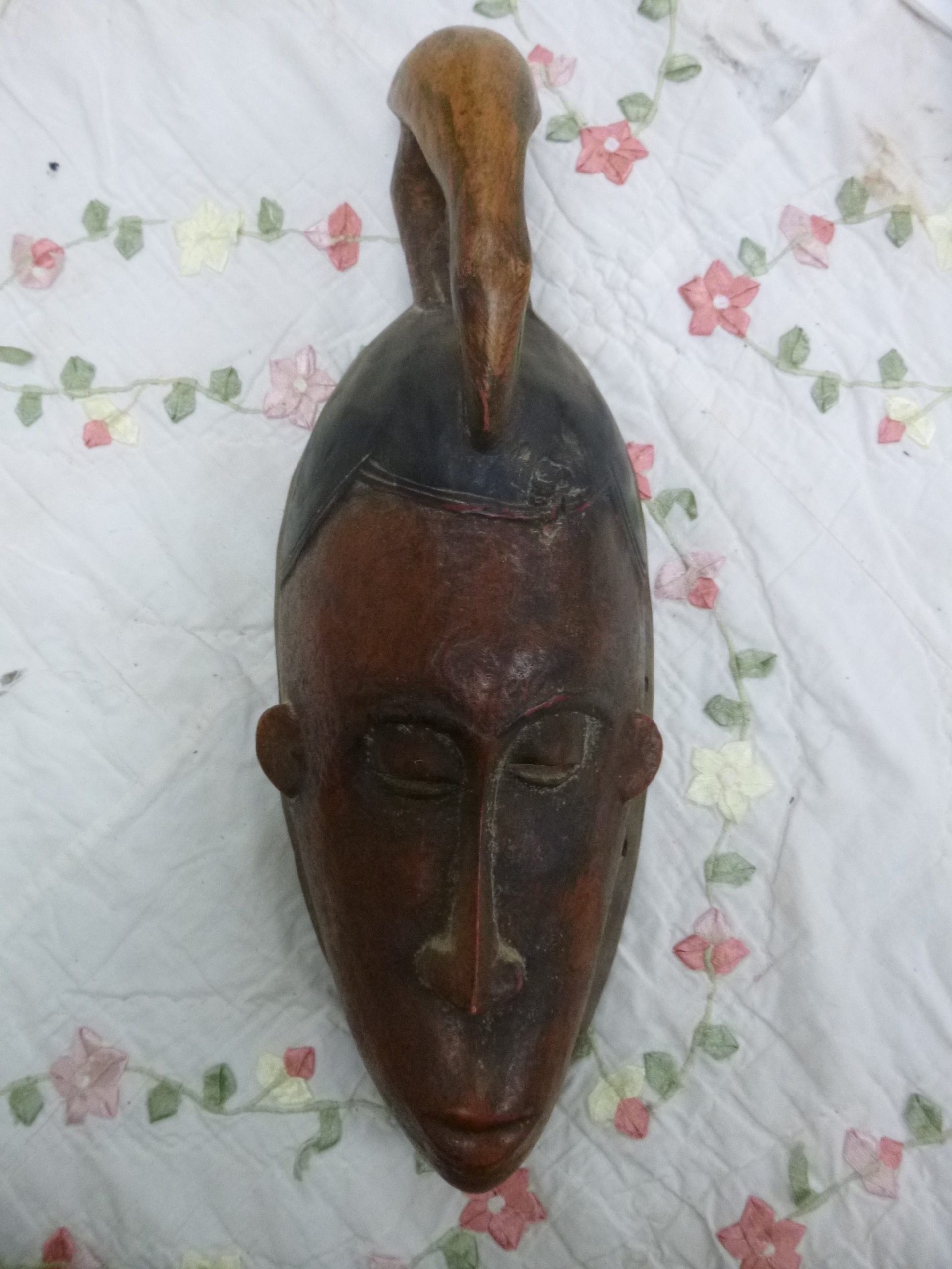 A wooden mask resembling an elongated human head with closed eyes. The hairstyle is close-cropped and smooth, painted black with a bird leaning down to touch its beak to the forehead. The rim of the mask has holes for tying.Collection
