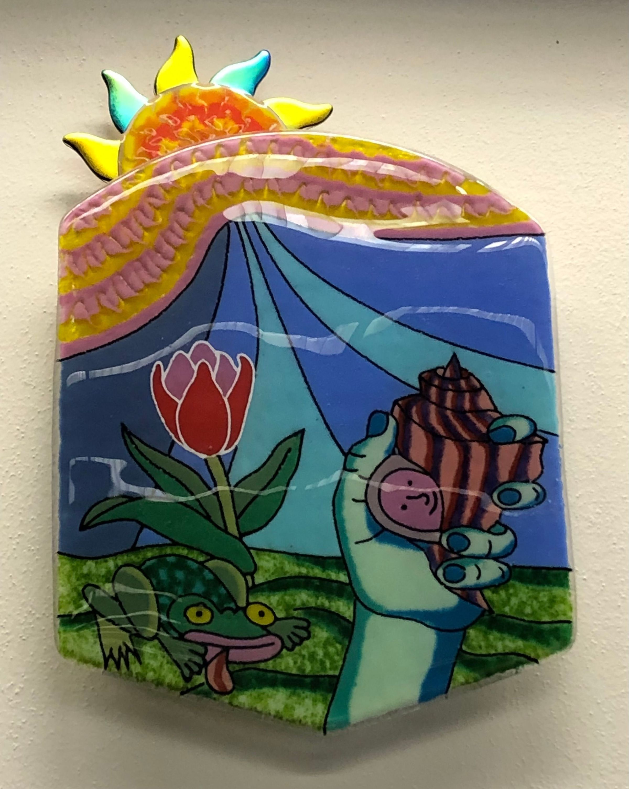 A rounded, hexagonal plate of fused glass with multicolored design. The main image depicts a speckled green frog to the left, a red and pink flower behind it, and a blue hand holding a pink and purple striped shell, set against a background of multicolored sun rays, green hills, and a fused metallic sun behind the panel.Collection