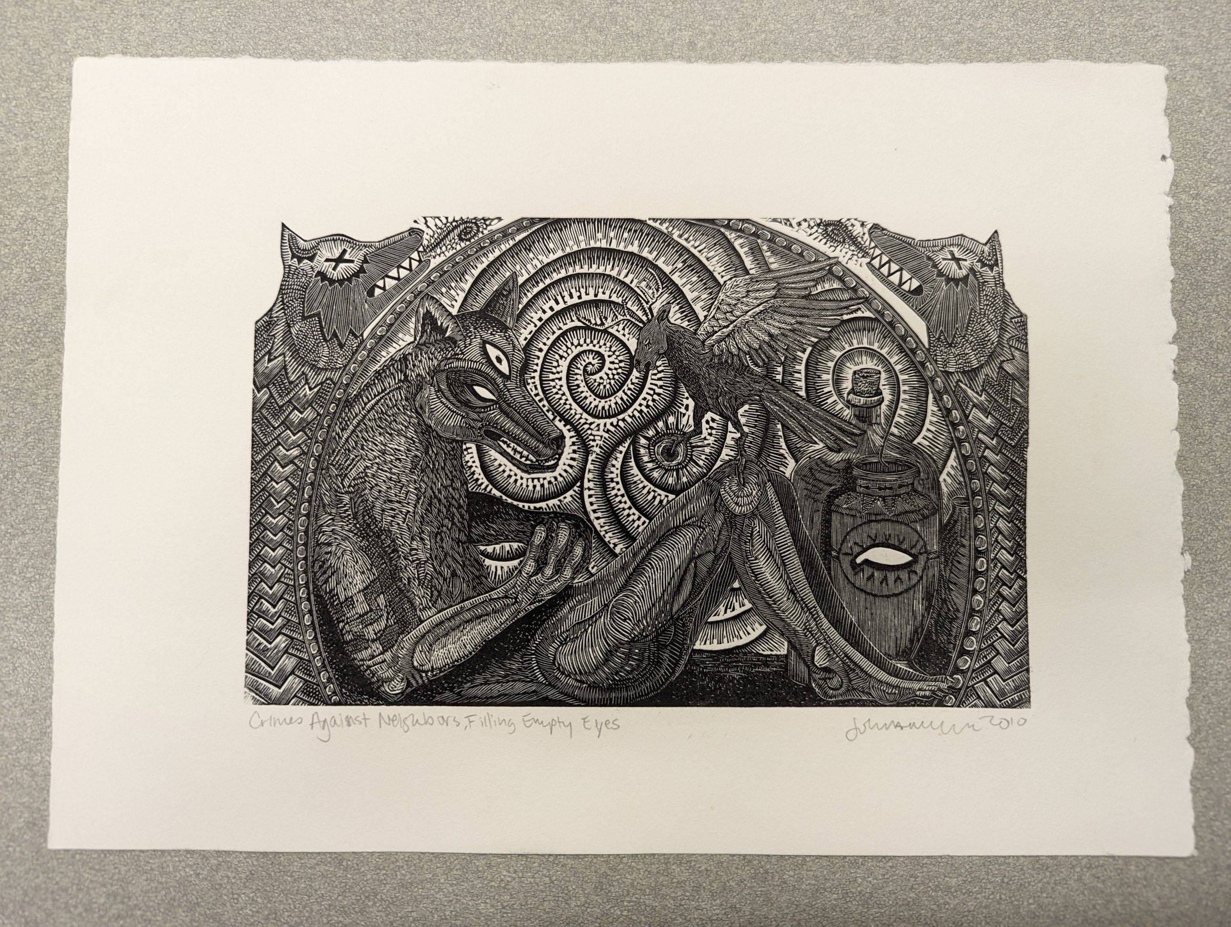 A print of an anthropomorphic wolf with three eyes sitting with a bird with a deer's head and a cask of liquid. The background has a complex swirling design flanked by effigies of wolves with their eyes crossed out.Context