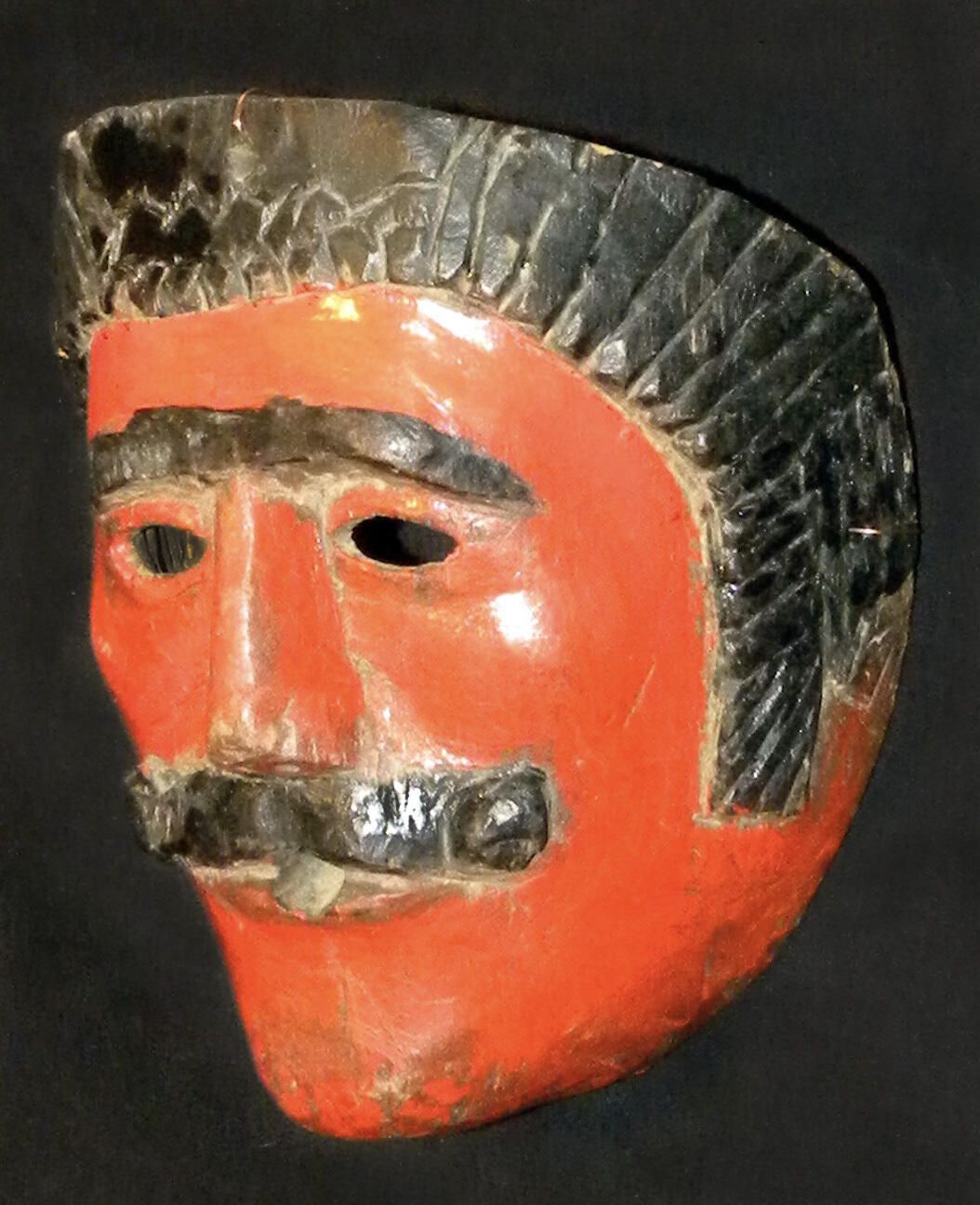 A life-sized oval wood mask depicting a man with an apple-red complexion. A black unibrow is above cutout eyeholes. A skinny nose is above a black mustache and a circular cutout hole on the lips to hold a cigarette. A copper wire is attached to the back of the mask. Scratch marks and signs of chipping concentrated on the chin area.Context