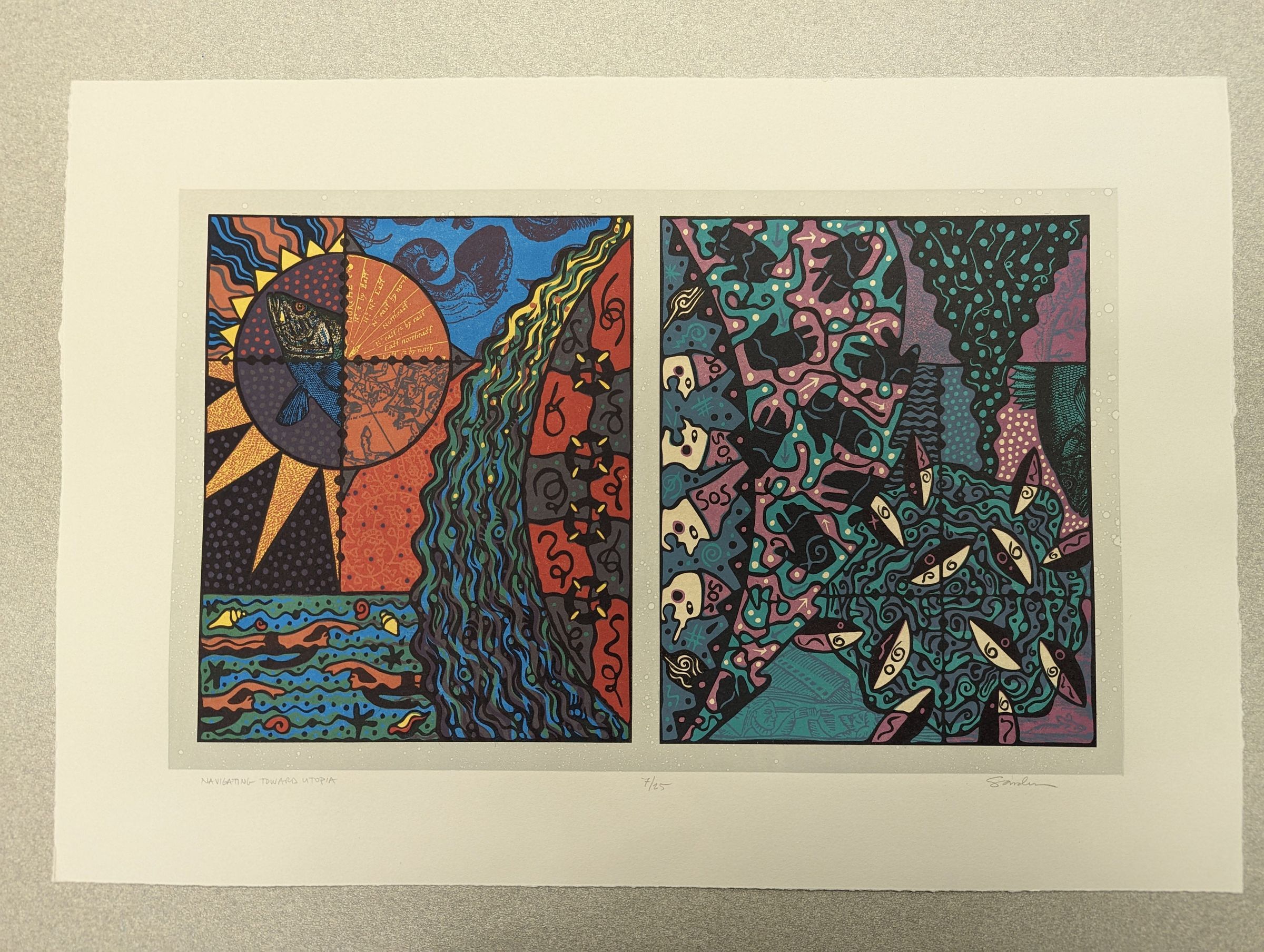 A horizontal print showing two squared scenes full of surreal designs and patterns. On the left, a fish swims inside a sun, which is flanked by a wave and checkered design, shells, and rows of swimmers. On the right, a row of hatted heads sits under a design of hands next to a swirl of seed-like shapes.Context
