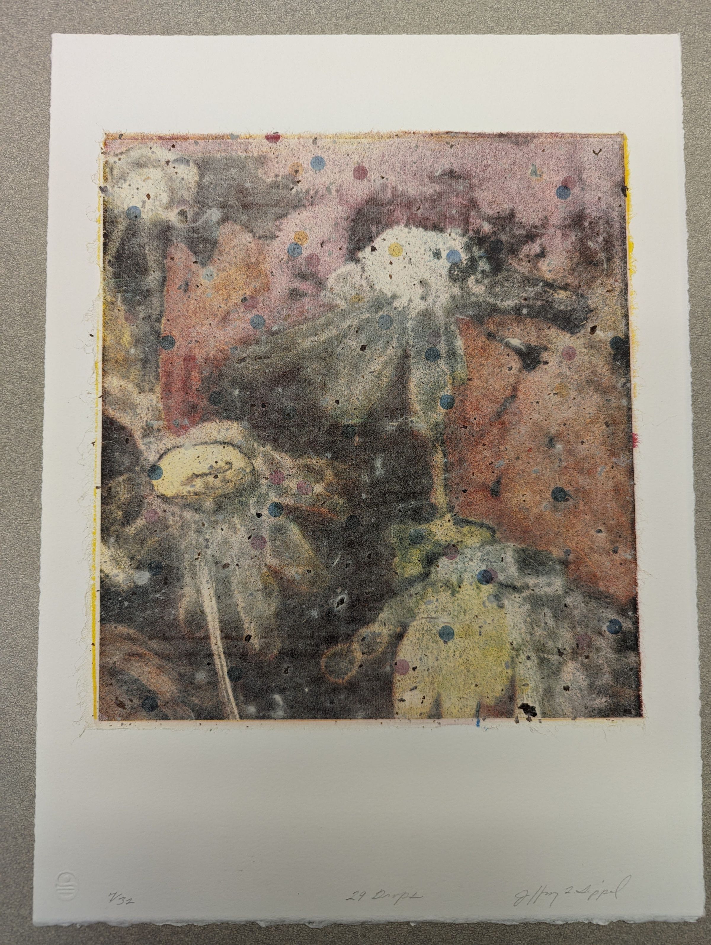 A medium vertical print showing a very blurred multicolored image of several flowers amidst black, pink, and orange backgrounds. The print is spattered all over with droplets of pigment in blue, pink, yellow pigments.Context
