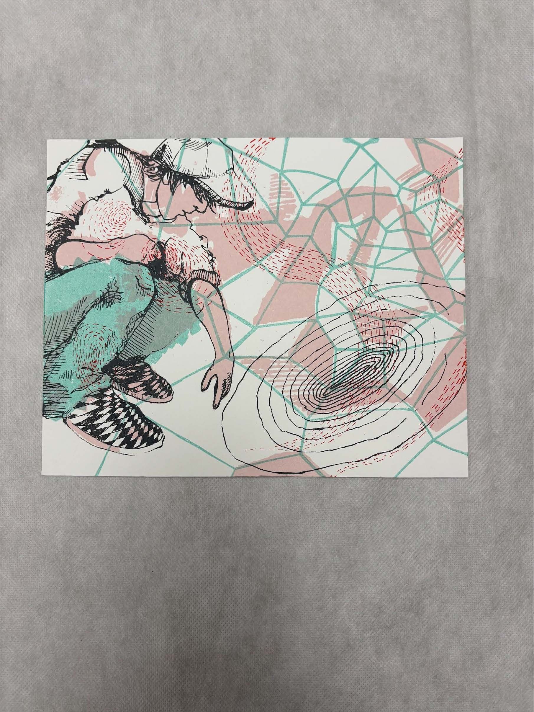 A horizontally oriented, medium sized print that uses teal, red, white and black pigments to construct its composition. The composition consists of a primary figure on the proper right side of the print looking down into a ripple of circles, dashes and geometric lines in the bottom proper left corner.Collection