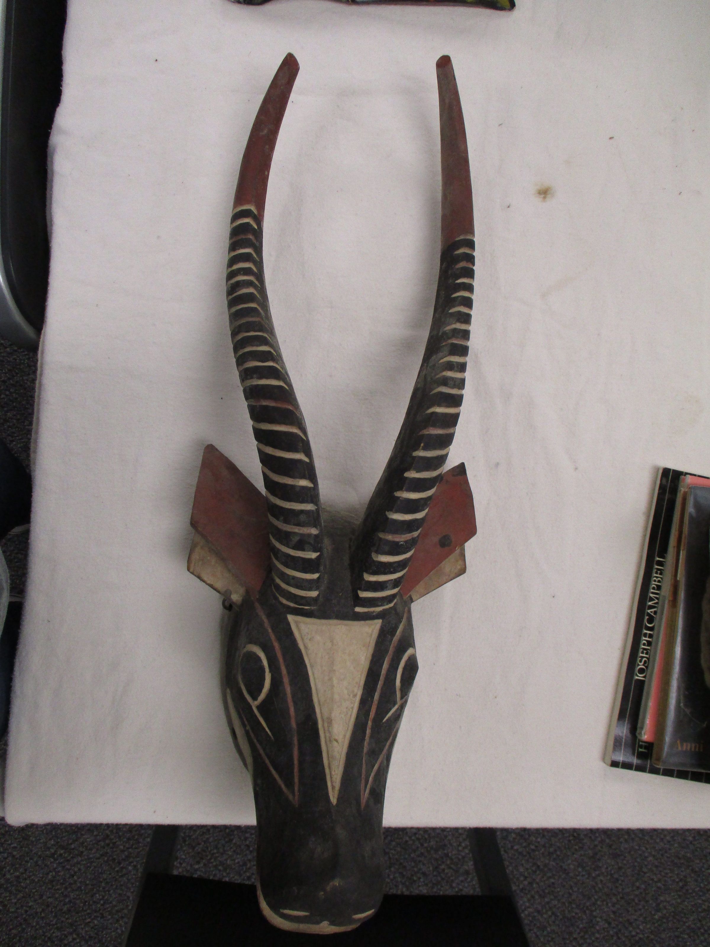 Medium wooden antelope mask with gesso paint in stylized black, red, and tan colors, with white cheeks. Hanging wire affixed by drilled holes.Collection
