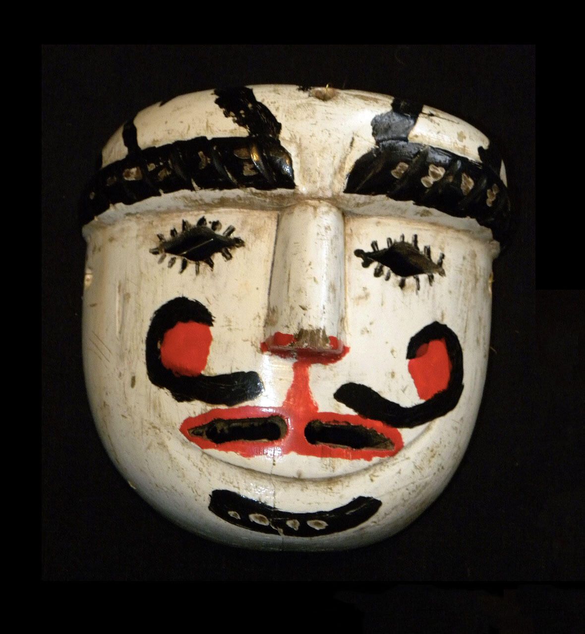 A small round wood mask depicting a man with a white face. Two cutout eyeholes are outlined with painted black eyelashes and under large black eyebrows. A rectangular nose has a red tip that goes around a mouth created by two separated cutout ovals. A painted black mustache curls around red cheek circles. There is a black line on the chin. A wire is attached to the back of the mask. Overall signs of cracking and paint loss.Context