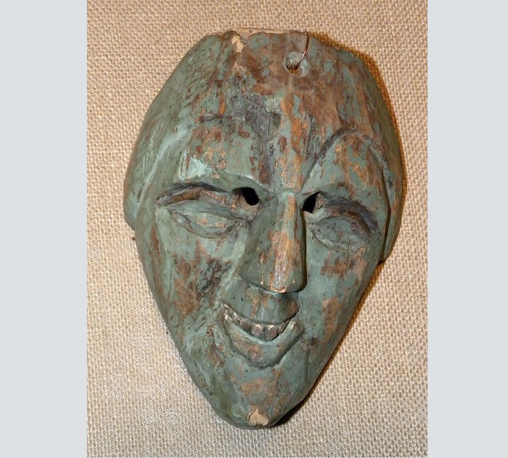 A life-sized diamond wood mask depicting a light fern-green figure. Hair and arched eyebrows are created with incised lines. Carved eyes are under circular cutout eyeholes. A large straight nose is above a small grinning mouth. A wire is attached to the back of the mask. Overall signs of chipping and paint loss that have created a muddled texture.Context