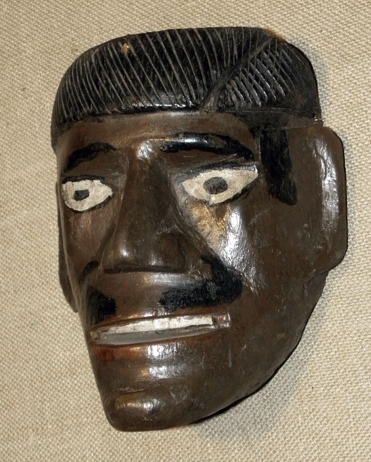 A life-sized rectangular wood mask depicting a man with a brown complexion. The black hair is decorated with incised lines and extends into short sideburns. Painted black eyebrows are above painted brown eyes. A large nose is above a parted black mustache and a slightly open mouth with white teeth. A wire is attached to the back of the mask.Context