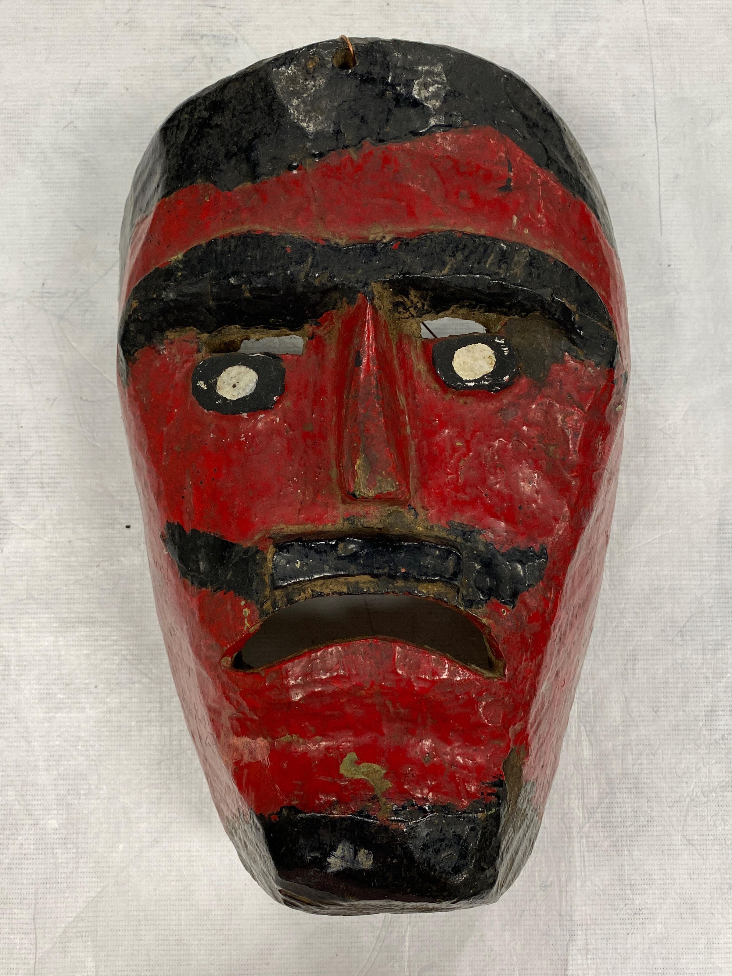 A life-sized triangular wood mask depicting a man with a garnet-red complexion. A black unibrow is over cutout eyeholes for the wearer and white eyes. A small nose is above an upturned black mustache a frowning mouth. The hair and goatee are black. A wire is attached to the back of the mask. Various signs of paint chipping expose the wood.Context