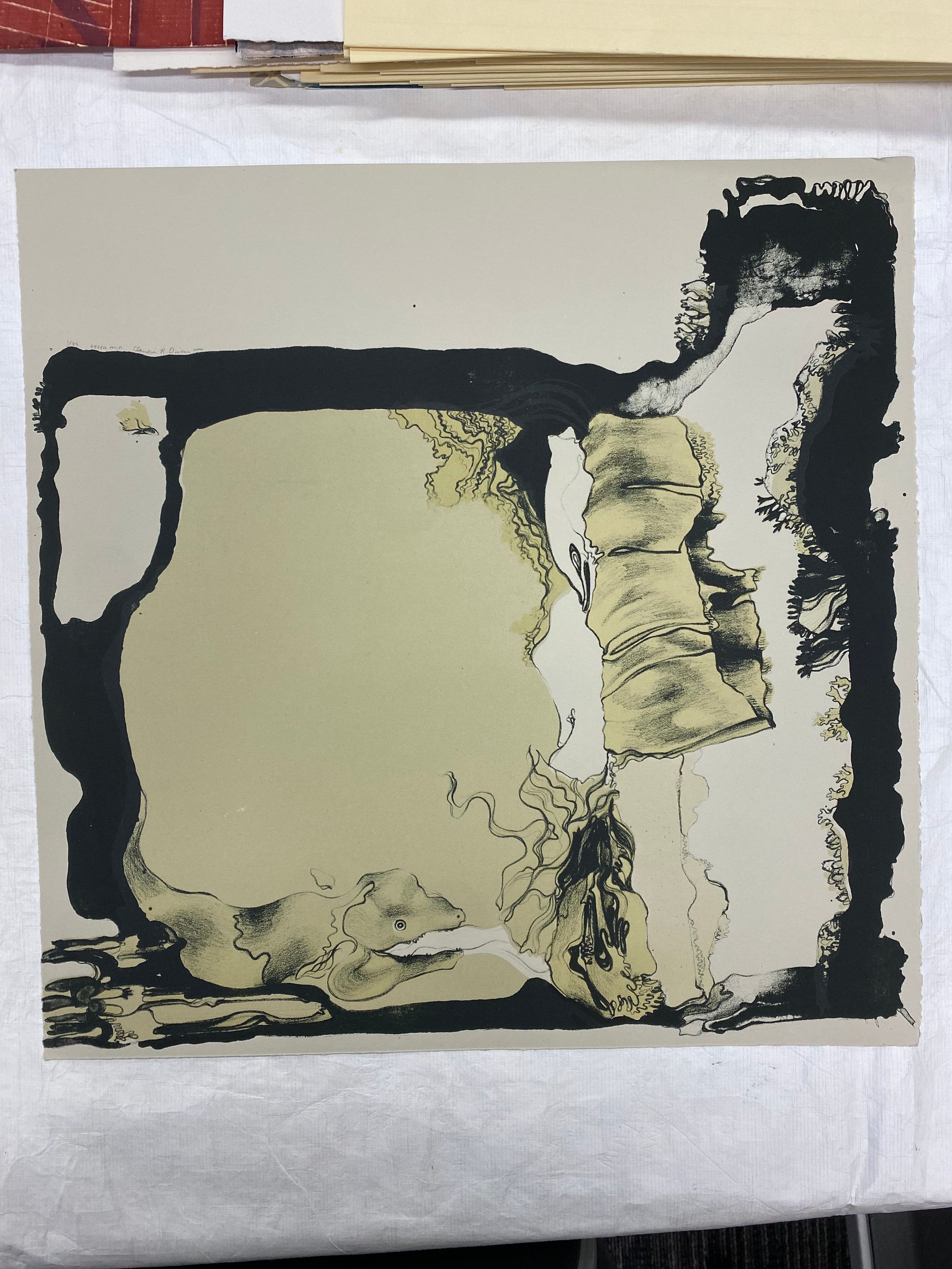 Large square vertically oriented print on cotton rag paper containing a scene of an abstract underwater world with an eel depicted in the right bottom region of the print in profile with its mouth open.