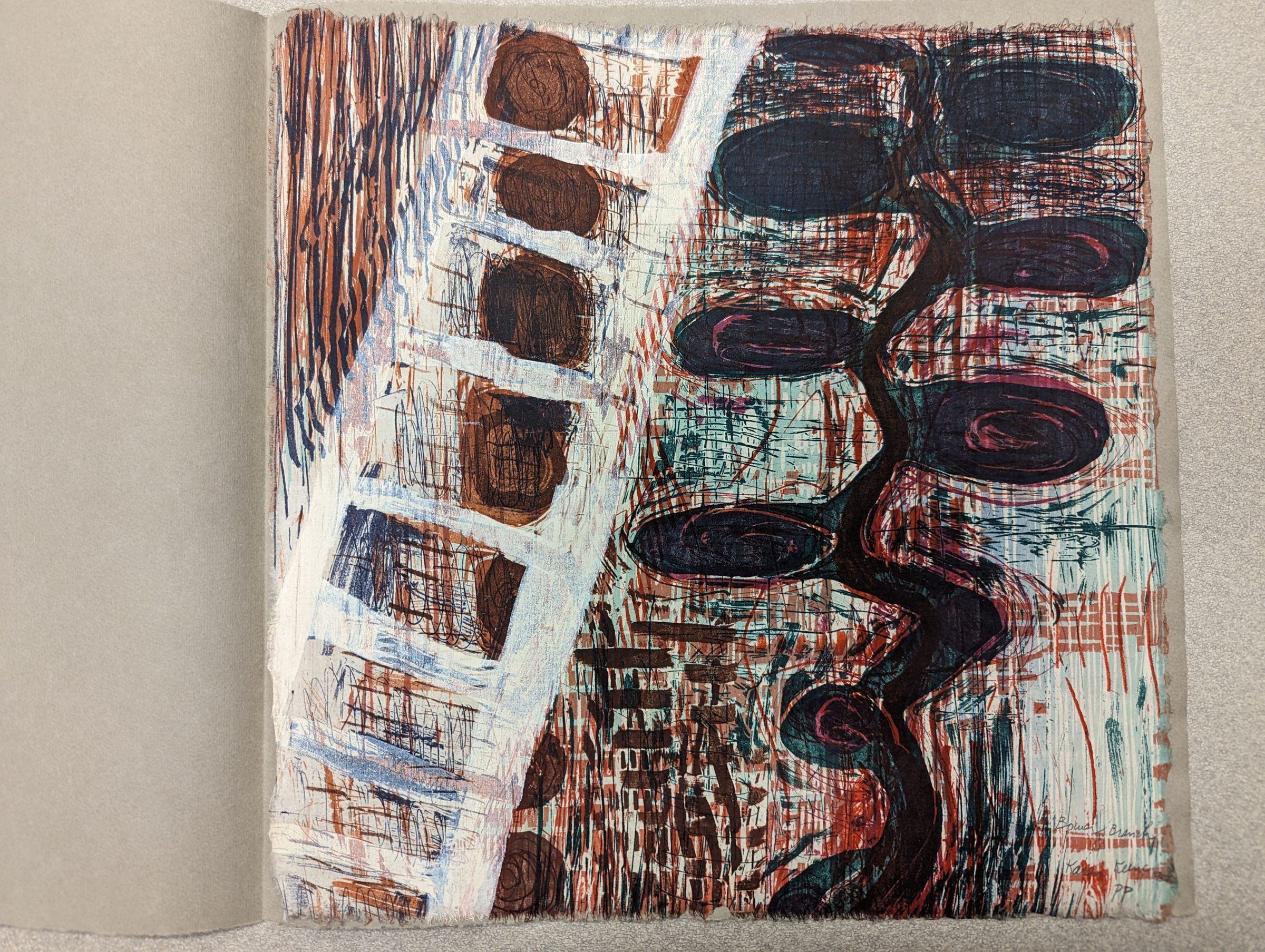 A print showing a white ladder in front of stacked brown circles and a pattern suggesting a brick wall; to its right, there's an abstracted/surreal depiction of a tree going up the page. The background is heavily patterned and sketchy with pale green and red. The print is kept in a folded piece of grey paper with the title printed on its front.Context