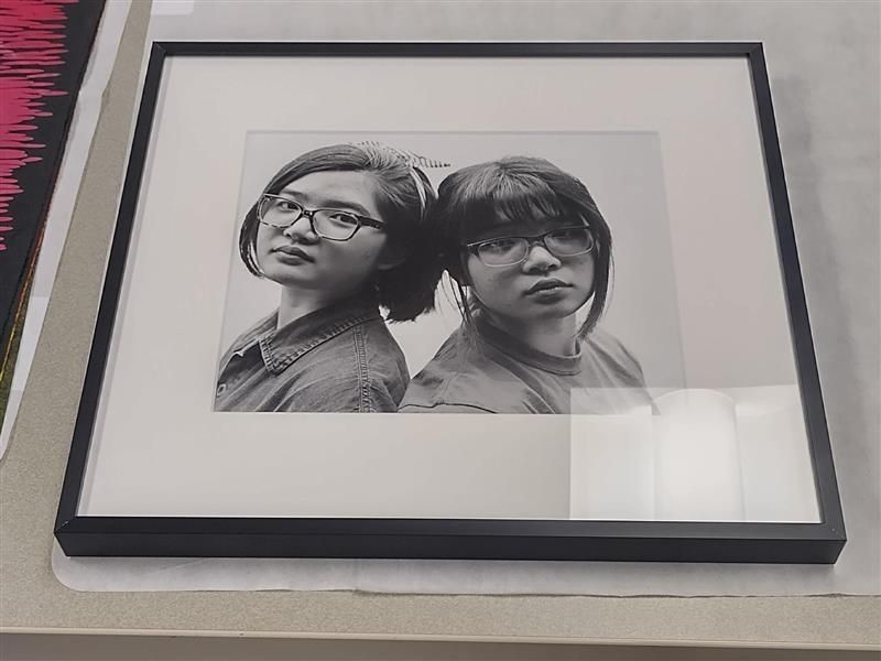 An image of two women who are standing back to back and looking off to the side towards the camera. They both have serious expressions, glasses, and appear from the shoulder up in the image.Collection