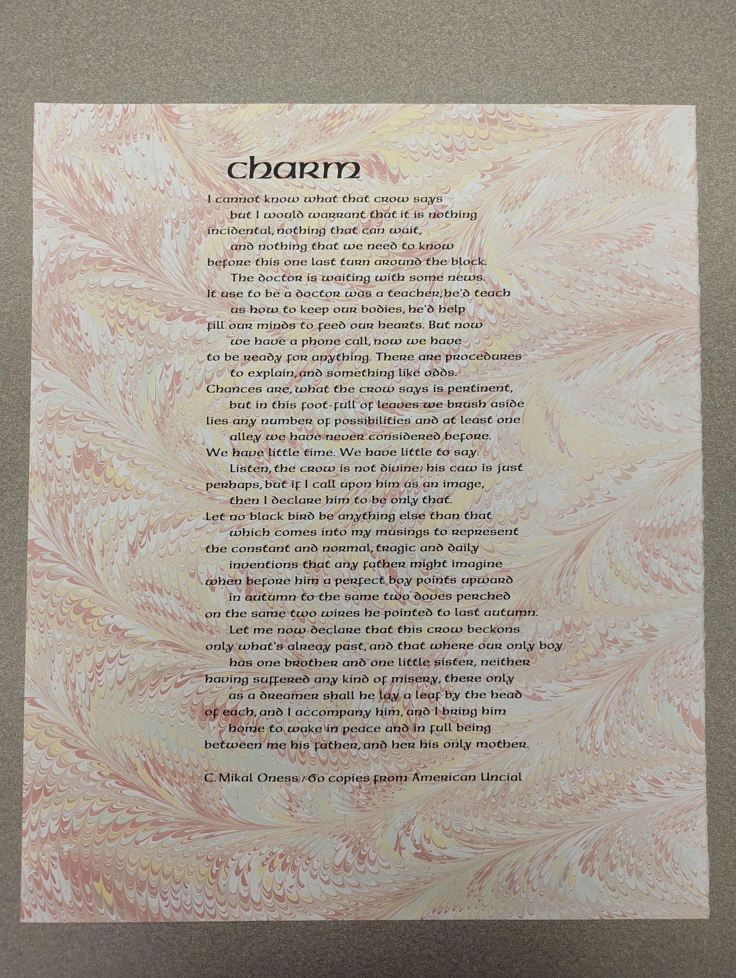 A large vertically-oriented print of a poem, centered in an American Uncial font, titled "Charm." The poem was written by C. Mikal Oness for the Campbell Corner Poetry Contest of 2001. The poem is backgrounded by a feathery, sweeping abstract design in shades of red, white, green, and yellow. The back of the print has text annotating corrections to the text on the front.Context