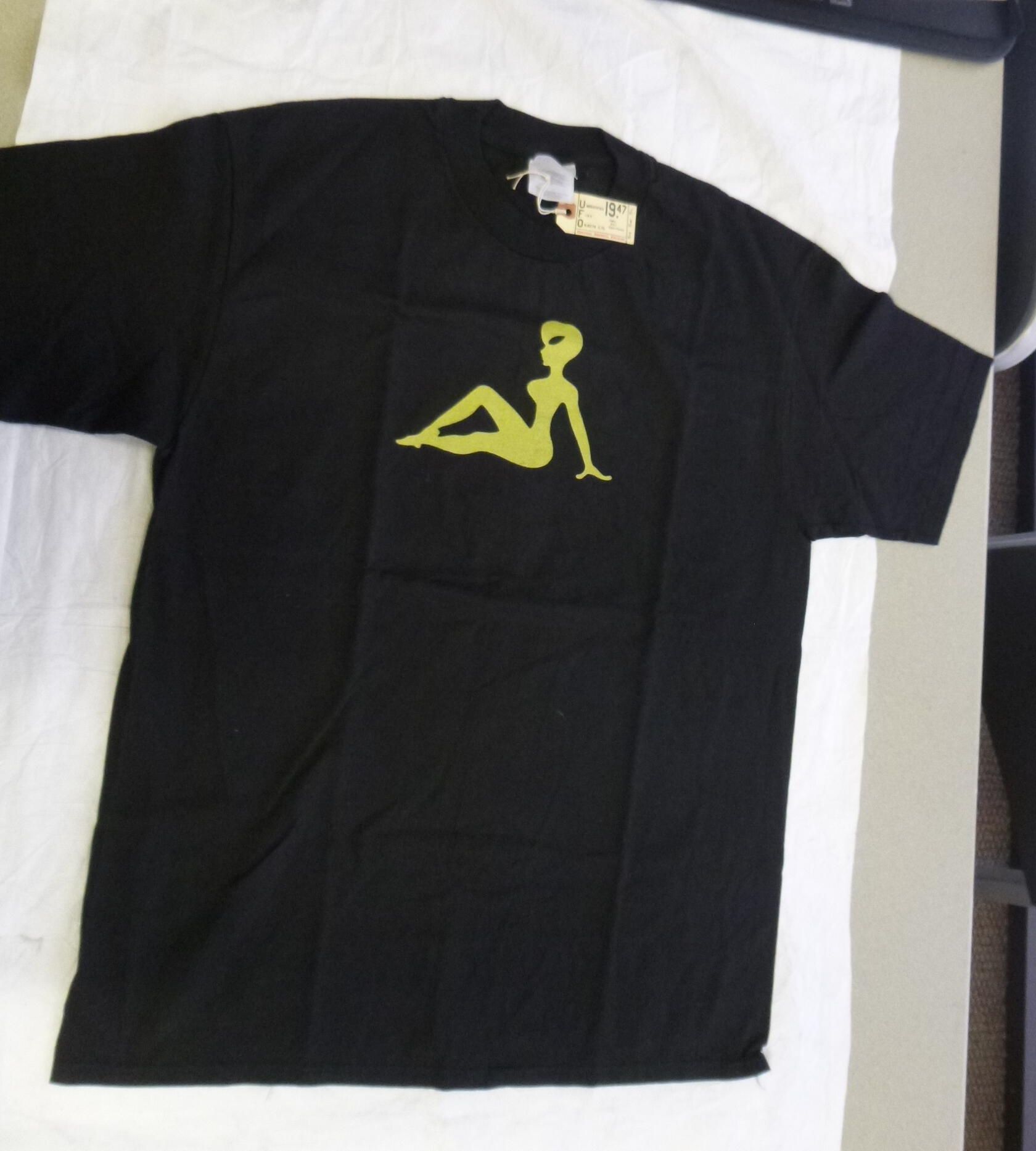 Large black T-Shirt with a screenprint of a female figure with an alien head.Collection