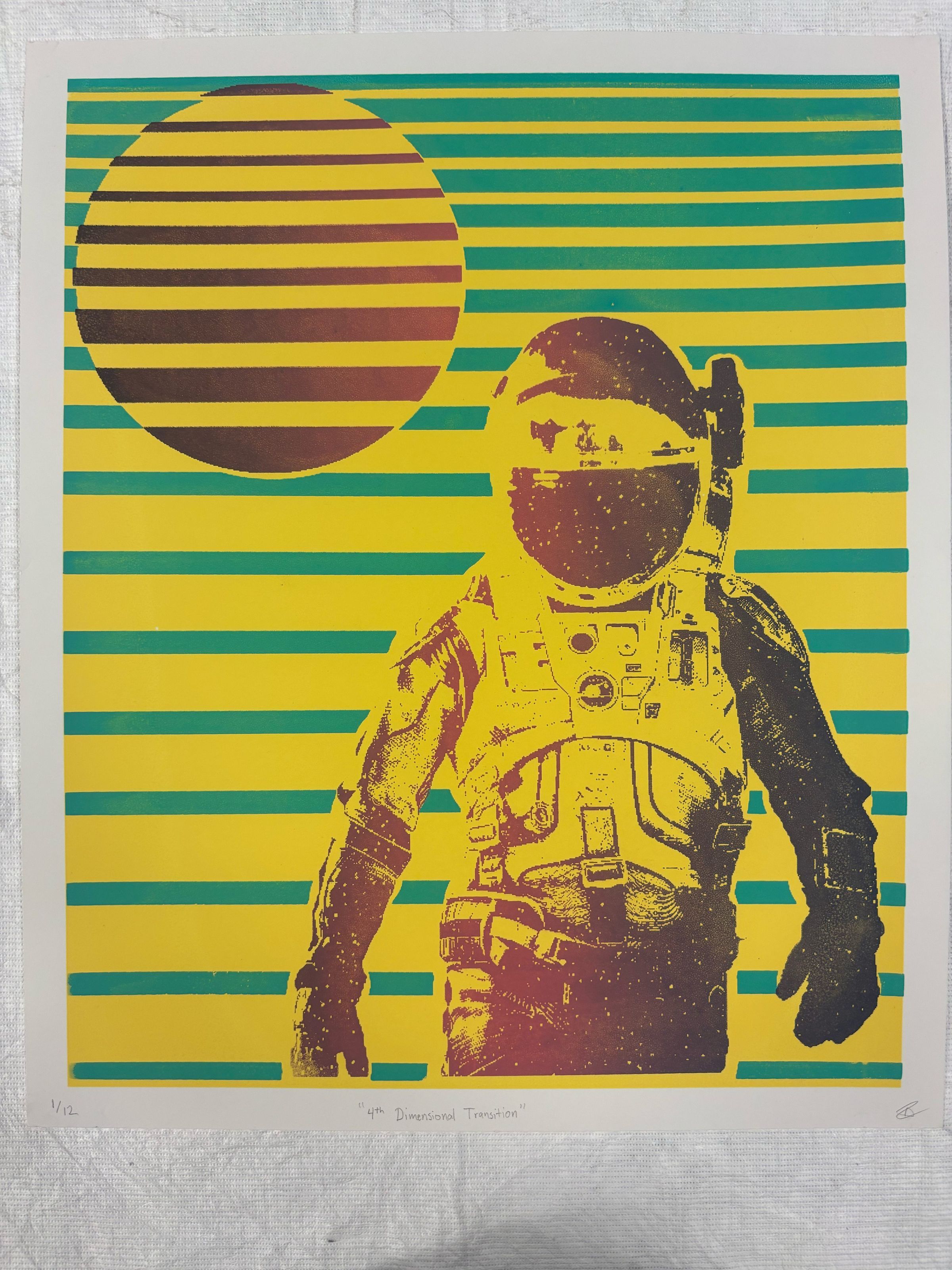 Medium, rectangular, vertically-oriented print depicting an astronaut and a moon with strips of lines running horizontally getting wider apart at the bottom. The lines are green against a yellow background and the astronaut figure and moon is printed in a magenta transitioning to deep purple.Collection