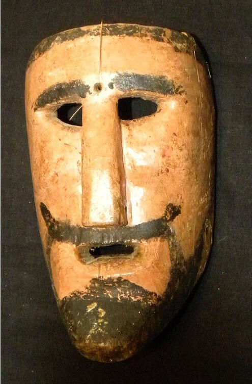 A life-sized, long and skinny wood mask depicting a man with a medium beige complexion. Black eyebrows are over cutout eyeholes. A long, flat nose is above an upturned black mustache and open mouth. The hair and beard are black. A wire is attached to the back of the mask. Overall signs of pigment loss.Context