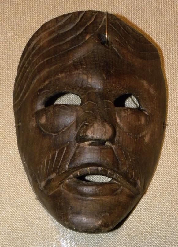 A long, oval-shaped wood mask depicting a man with incised hair, wrinkles, and mustache. There are cutout semi-circle eyeholes. The nose is subtly convex and decorated with horizontal incised lines. The open mouth is cut out directly under the large mustache. A wire is attached to the back of the mask. There are some cracks.Context