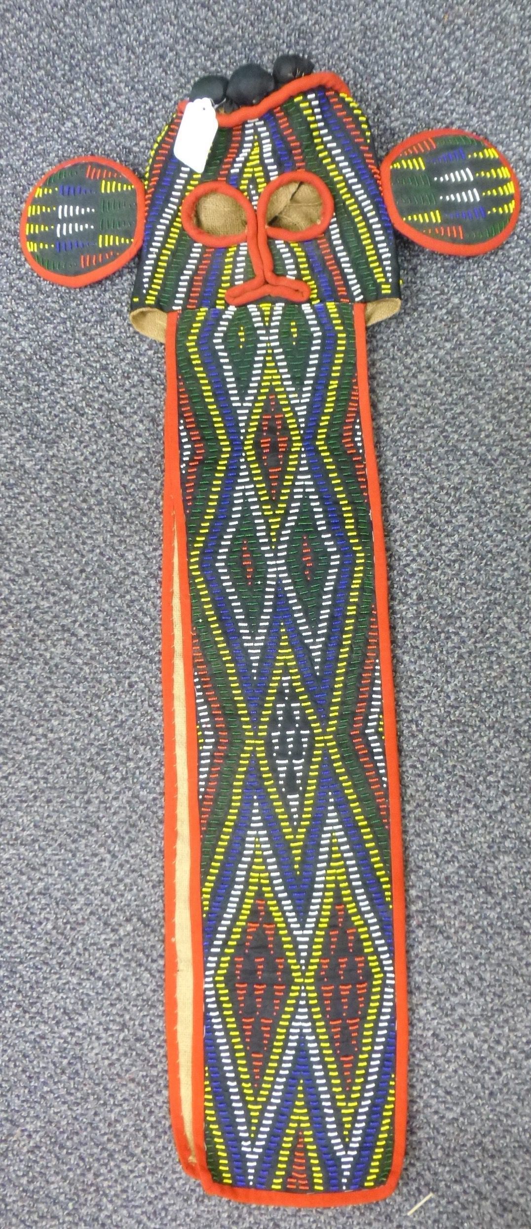 A mask that covers the head and has two long flaps going down the front and back. Orange fabric outlines boundaries for the ears, crown of the head, edge of the flaps, and the eyeholes/the mask's 'mouth'. The rest of the surface is dark and patterned with yellow, green, orange, blue, and white beads in diamond designs. Above the crown are fixed several black nodes.