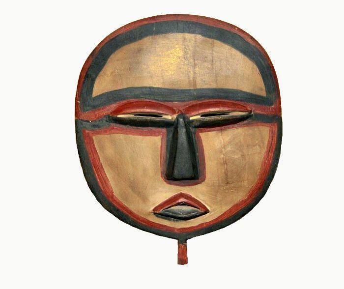 Circular, wood face mask with polychrome stripe across slit eyes and with triangular nose and mouthCollection