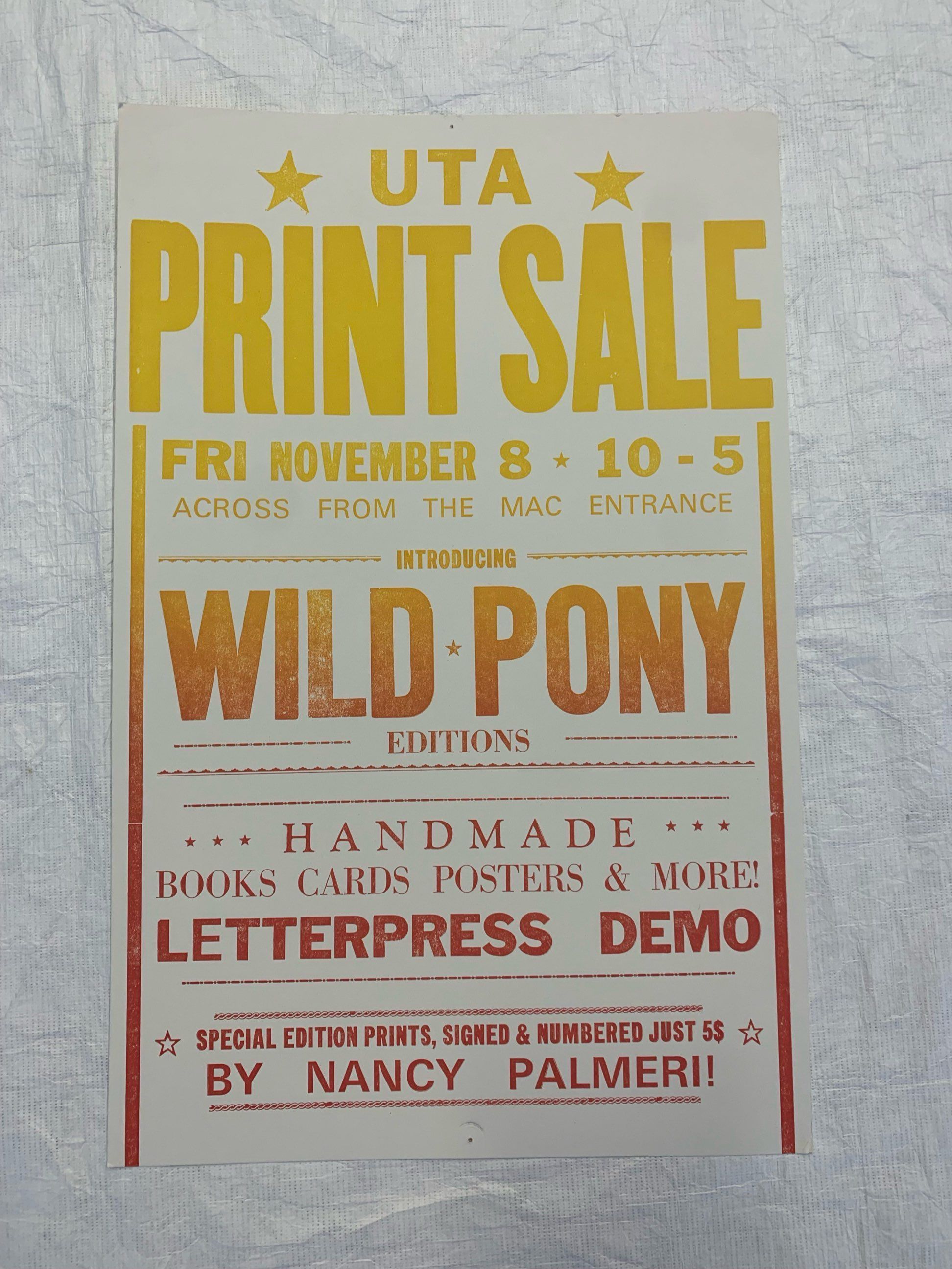 Advertisement poster for a print sale by Wild Pony printing studio using the letterpress technique of "rainbow roll" with yellow, orange, and red pigment.Collection