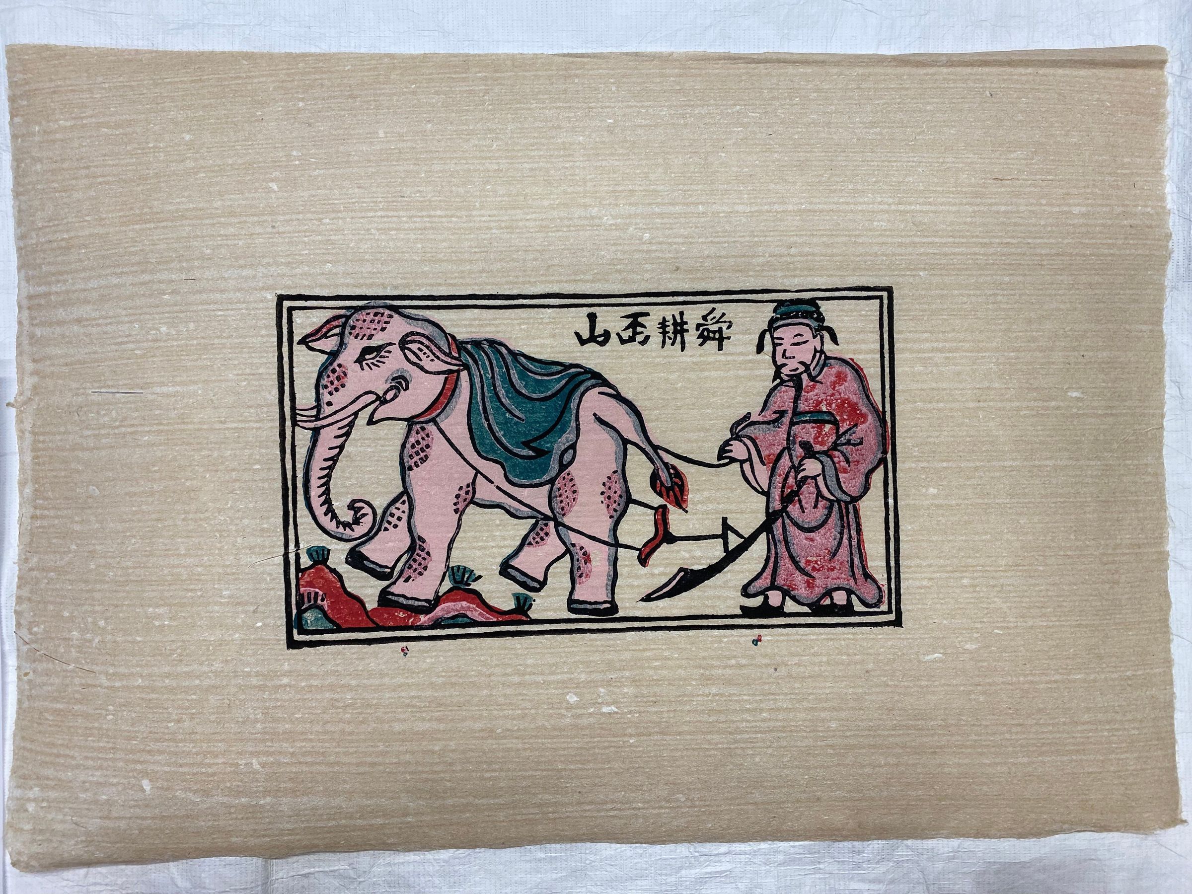 Traditional Vietnamese folk woodblock print on plant fibrous paper that horizontally depicts a male figure following behind an elephant with a plough secured to the elephant being guided by the male figure. Vietnamese characters are to the right of the male figure's head across the top of the printed image.Context