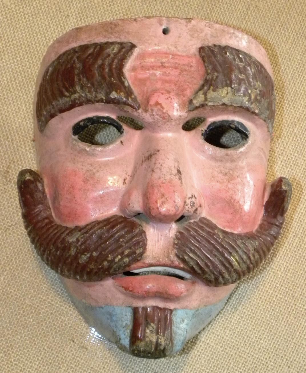 A life-sized triangular wood mask depicting a bald man with a lemonade-pink complexion. There are two sets of cutout eyeholes underneath large, incised brown eyebrows. A large, hooked nose is above a parted and curved brown mustache and a slightly open pink mouth showing a row of white teeth. The chin is painted sky blue and has a brown goatee. A wire is attached to the back. Some signs of pigment loss.Context