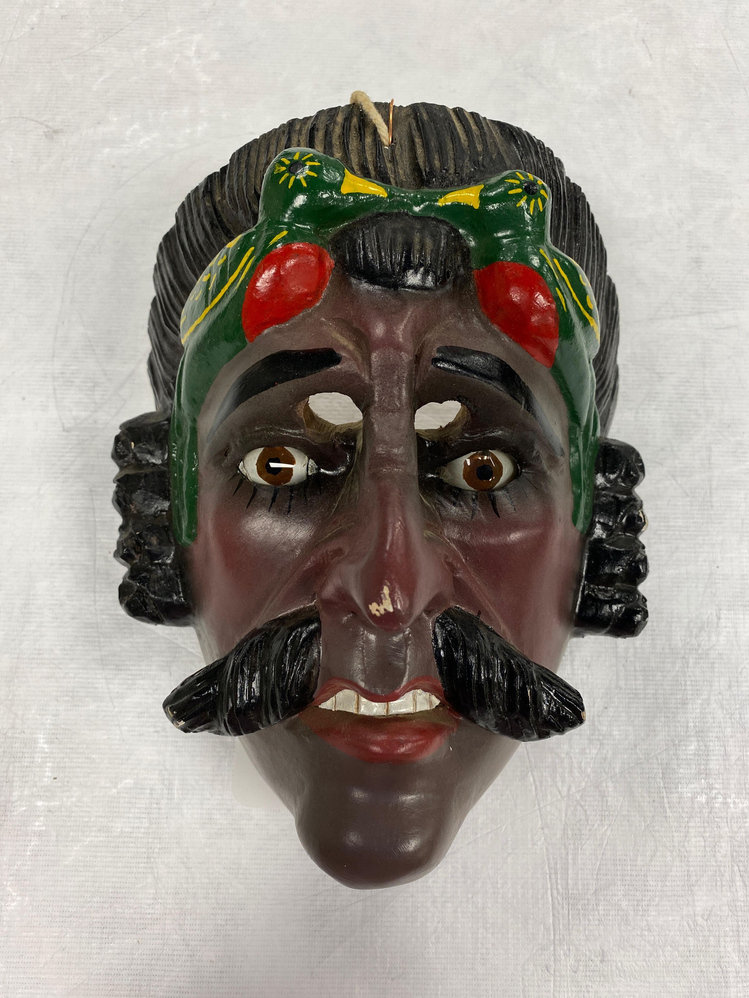 A long diamond face-shaped wood mask depicting a man with an umber brown complexion and plum purple accents on cheeks, nose, and forehead. The mask has vertically incised black hair that leads into curled sideburns. The hair is decorated with two dark green birds that connect beaks. There are two inset brown glass eyes with black eyelashes and black shading around the eyes. The cutout eyeholes for the wearer are under black eyebrows. The mouth is parted with dark red lips and white teeth. A parted black mustache is under a thin, hooked nose. A copper wire and string are attached to the back of the mask. The mask is in excellent condition despite some lost paint on the tip of the nose.Context