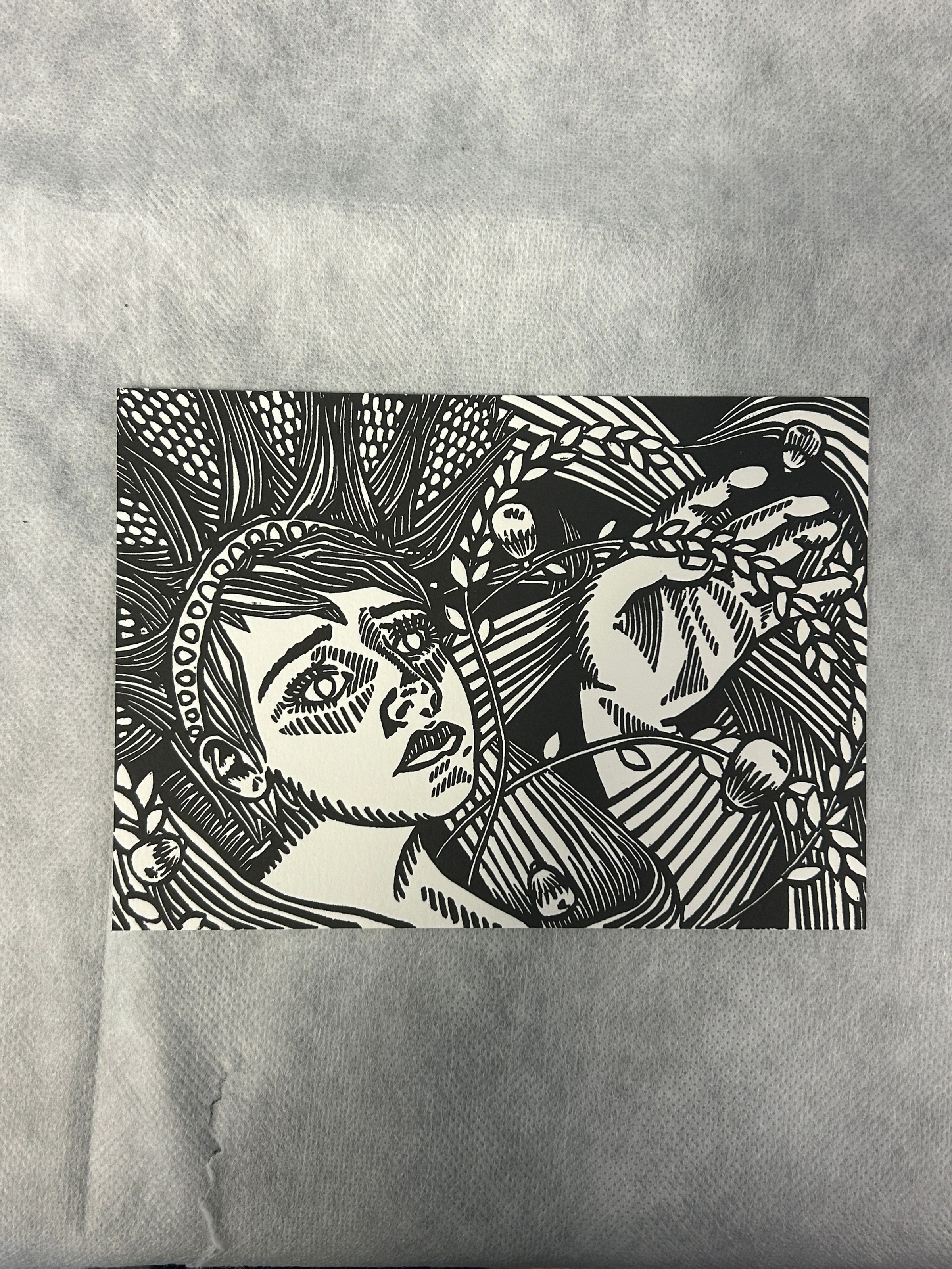a small print of a woman wearing a crown made of corn holding out her hand.Collection