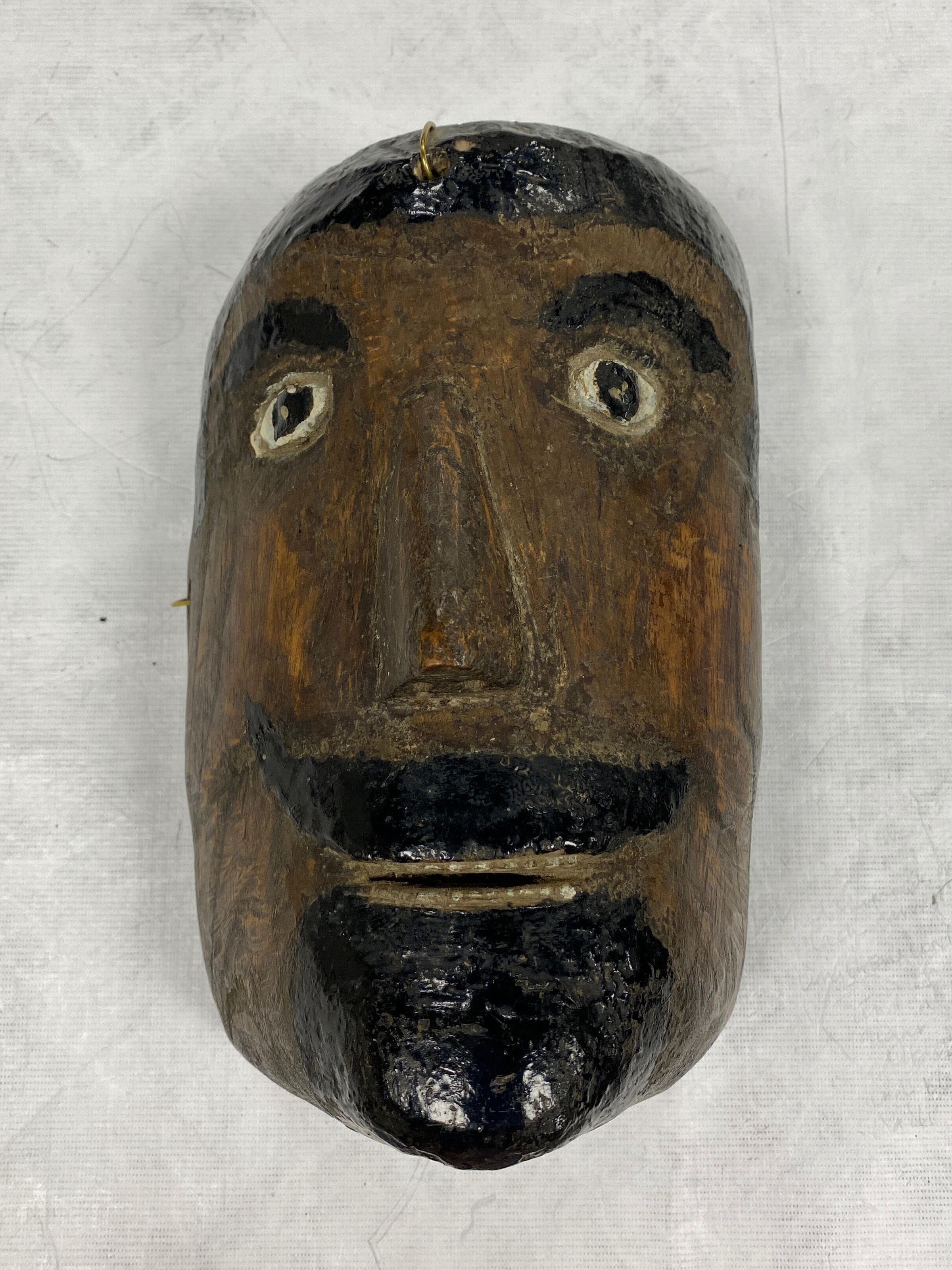 A life-sized rectangular wood mask depicting a man with walnut-brown skin. Black eyebrows are over carved eyes. A triangular nose is above a black mustache and a slightly open mouth. There is black hair and a black goatee. A wire is attached to the back of the mask.Context