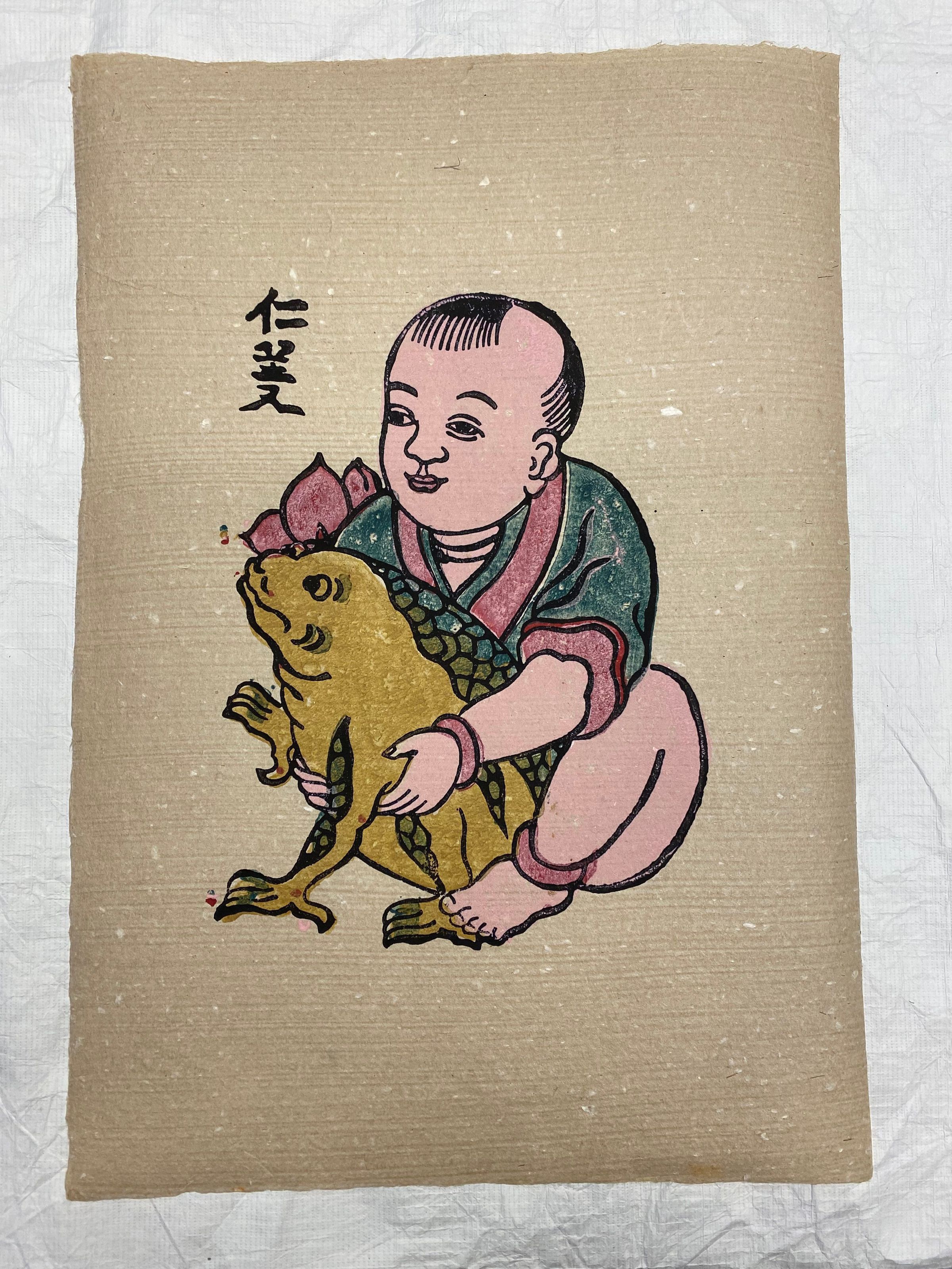 Traditional Vietnamese folk woodblock print on plant fibrous paper vertically depicts a centralized baby-like human figure hugging a giant toad in mimicked frog squat with a small lotus flower and Chữ Nôm characters to the right of the figure.Context