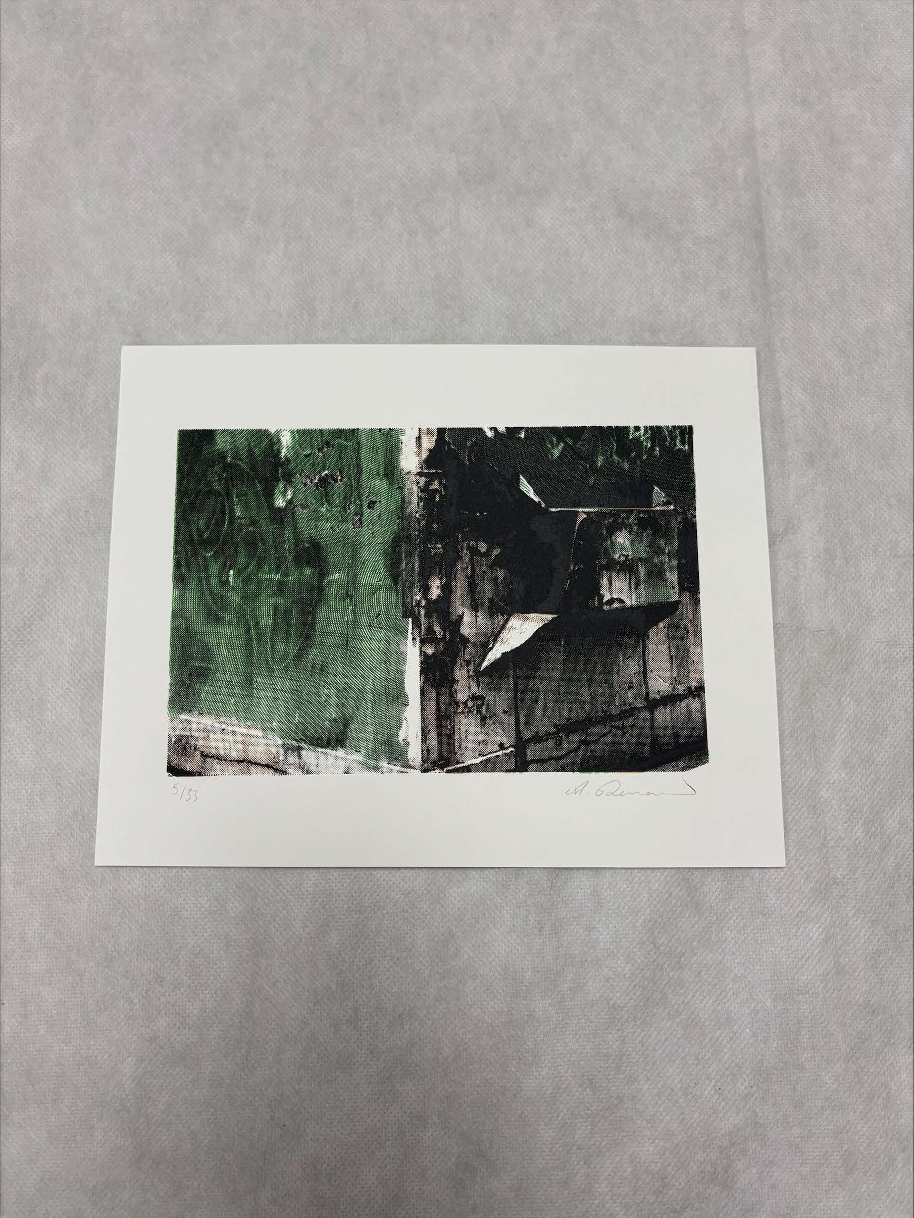 A horizontally oriented, medium sized print that uses tones of black, green, grey and white to create its composition. This print layers pigment over a printed photograph and is constantly repeating square shapes along with curving and swirling lines.Collection