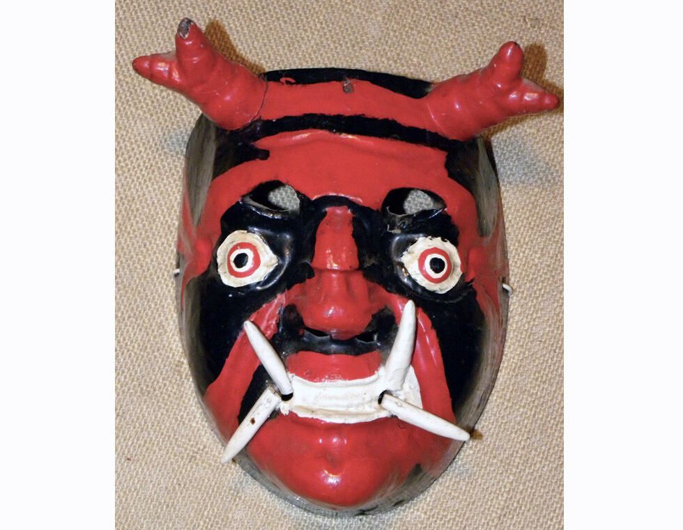 A life-sized oval wood mask depicting a figure with a black complexion and red designs. Two forked red horns protrude from the head. Two black eyes encircled with red and set in white circles. The cutout eyeholes for the wearer are above the eyes. A bumpy nose is above the mouth with white teeth and four white tusks. A white wire is attached to the back. Overall good condition despite some paint chipping.Context