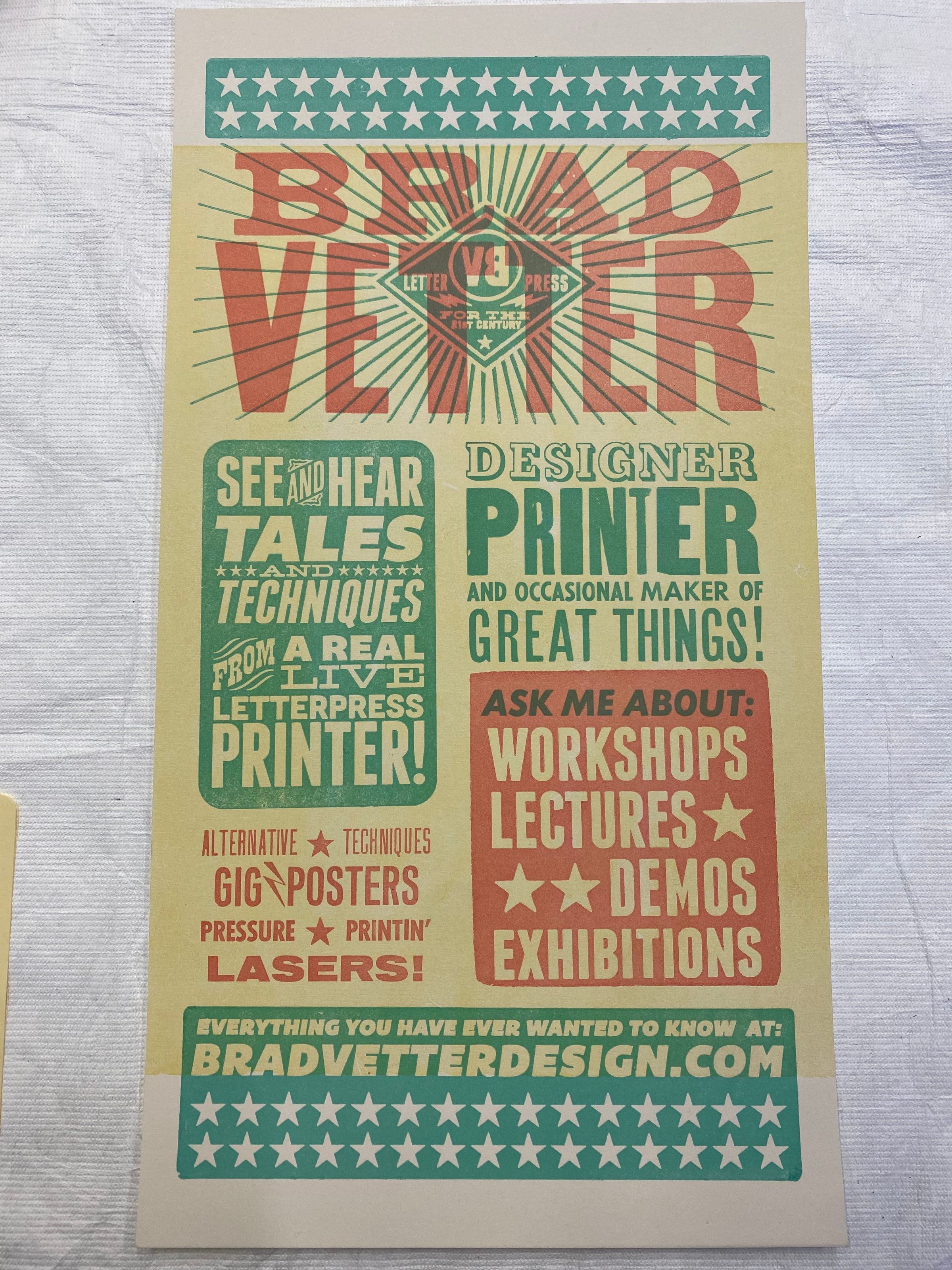 Medium vertically oriented poster promoting artist for skills in letter press printing and design using text and symbols such as stars or lightning bolts with a yellow wash over the center of the print.Context