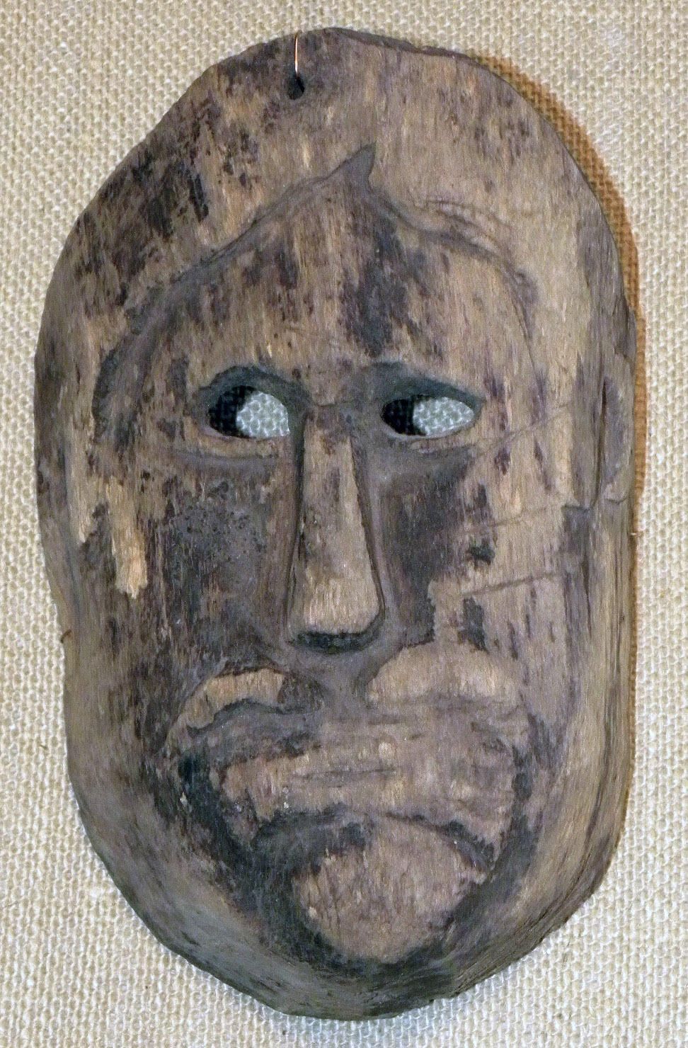 A life-sized rectangular wood mask depicting a man with close-set cutout eyeholes. A skinny, elongated nose is above a parted mustache and a closed mouth. Three diagonal slashes on the left cheek. A wire is attached to the back of the mask.Context