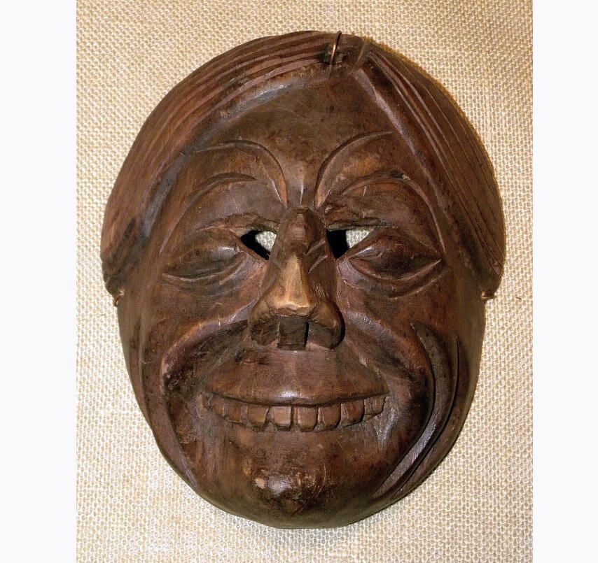 A life-sized circular wood mask depicting a woman. The hair is cropped and decorated with incised lines. There are two carved eyes on either side of triangular cutout eyeholes for the wearer. There are incised lines around the eyes and on the forehead to mimic wrinkles. The hooked nose is above a grinning mouth with a row of large teeth. There are prominent laugh lines. A wire is attached to the back of the mask. The mask is in excellent condition except for some minor scratches.Context