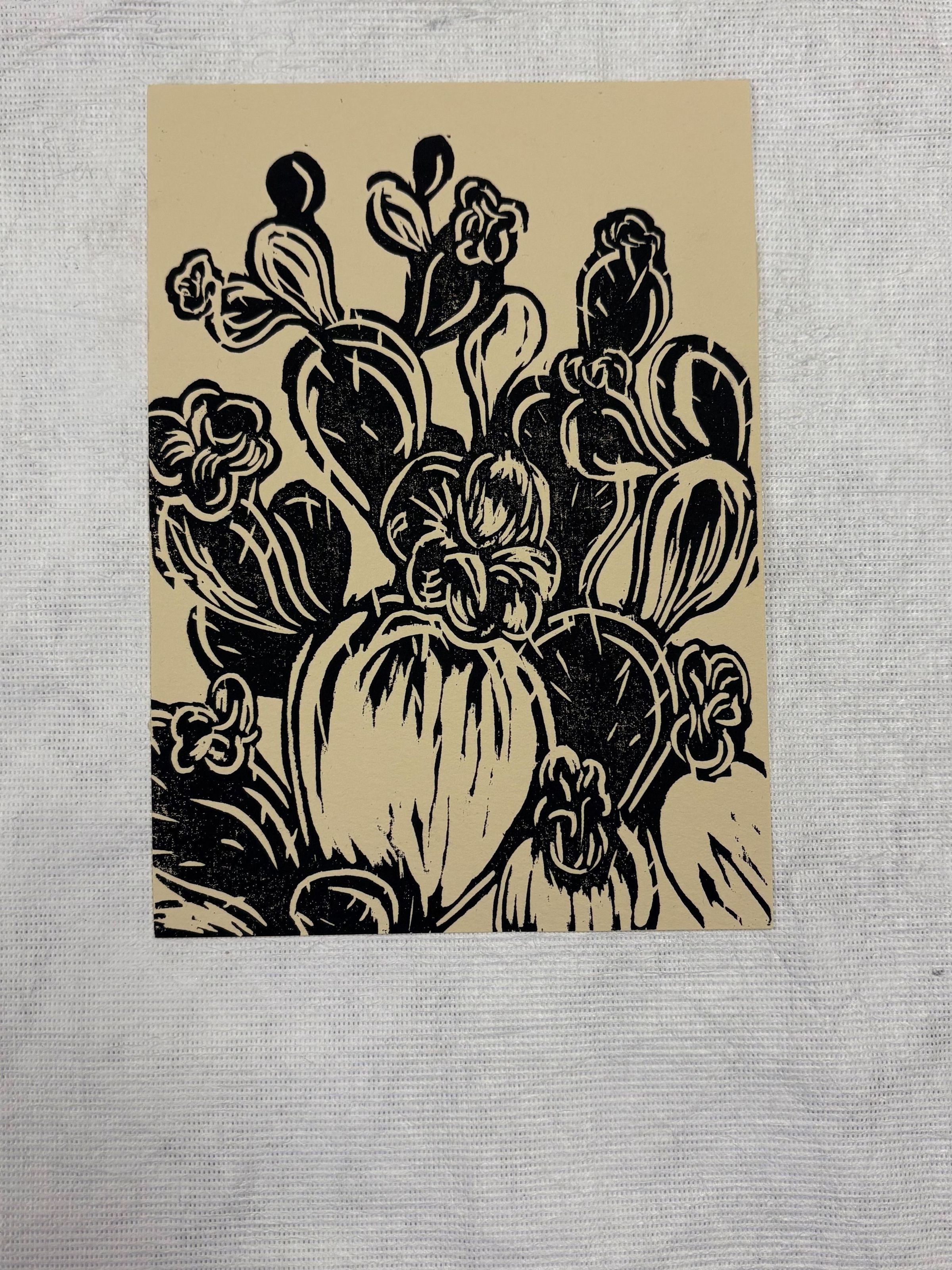 A vertically oriented print that is done on a cream ground with black pigment. The print has no figural imagery and depicts a large cactus with floral blooms on it.Collection