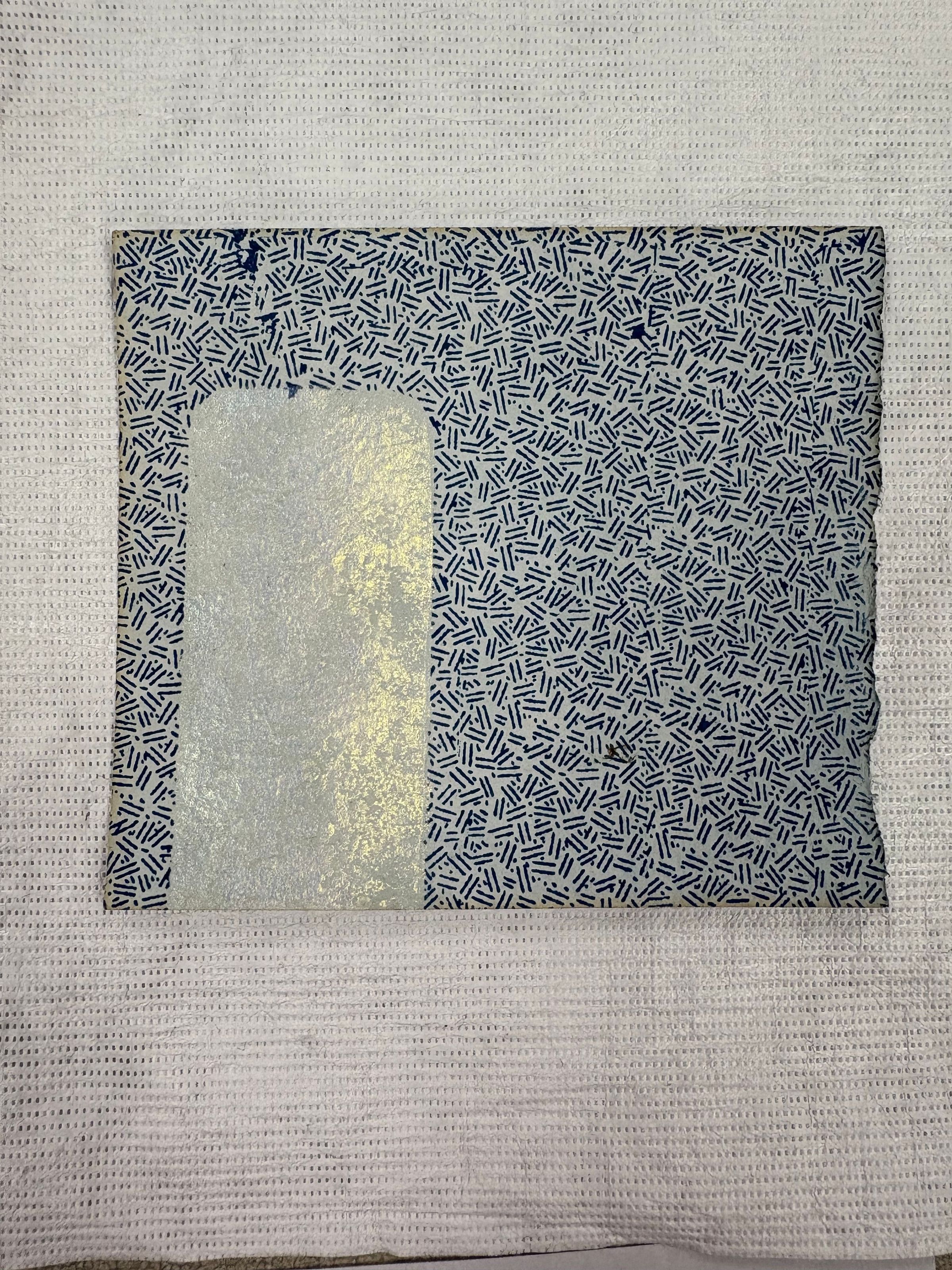 A small, horizontally oriented print that uses primarily blues and whites along with a pearlescent like embellishment. The print has no figural imagery, composed of dots and dashes that litter across the entirety of the print.Collection