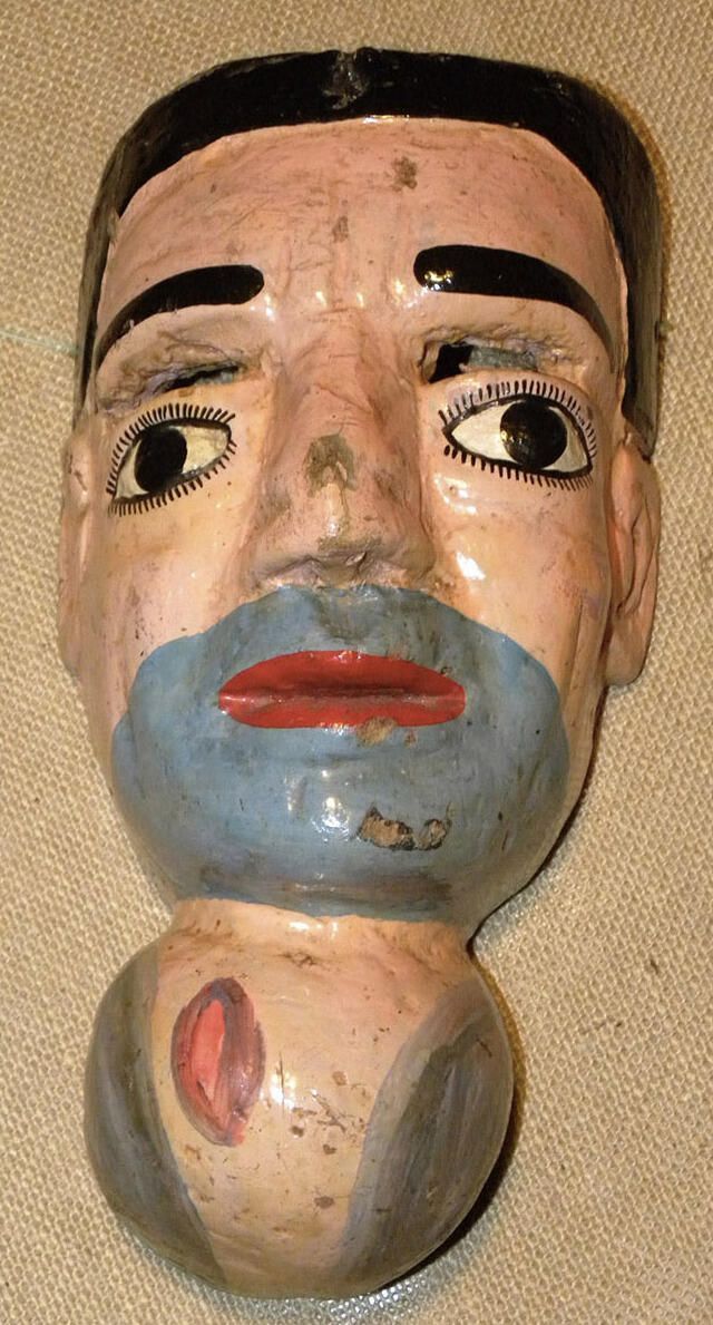 A life-sized rectangular wood mask depicting a man with ivory skin and short, black, painted hair and eyebrows. Two cutout eyeholes for the wearer are above painted eyes with black eyelashes. A crooked nose is above a light blue chin and a closed red mouth. There is a rounded, oblong goiter beneath the chin with a painted wound. A wire is attached to the back of the mask. Some signs of pigment loss.Context