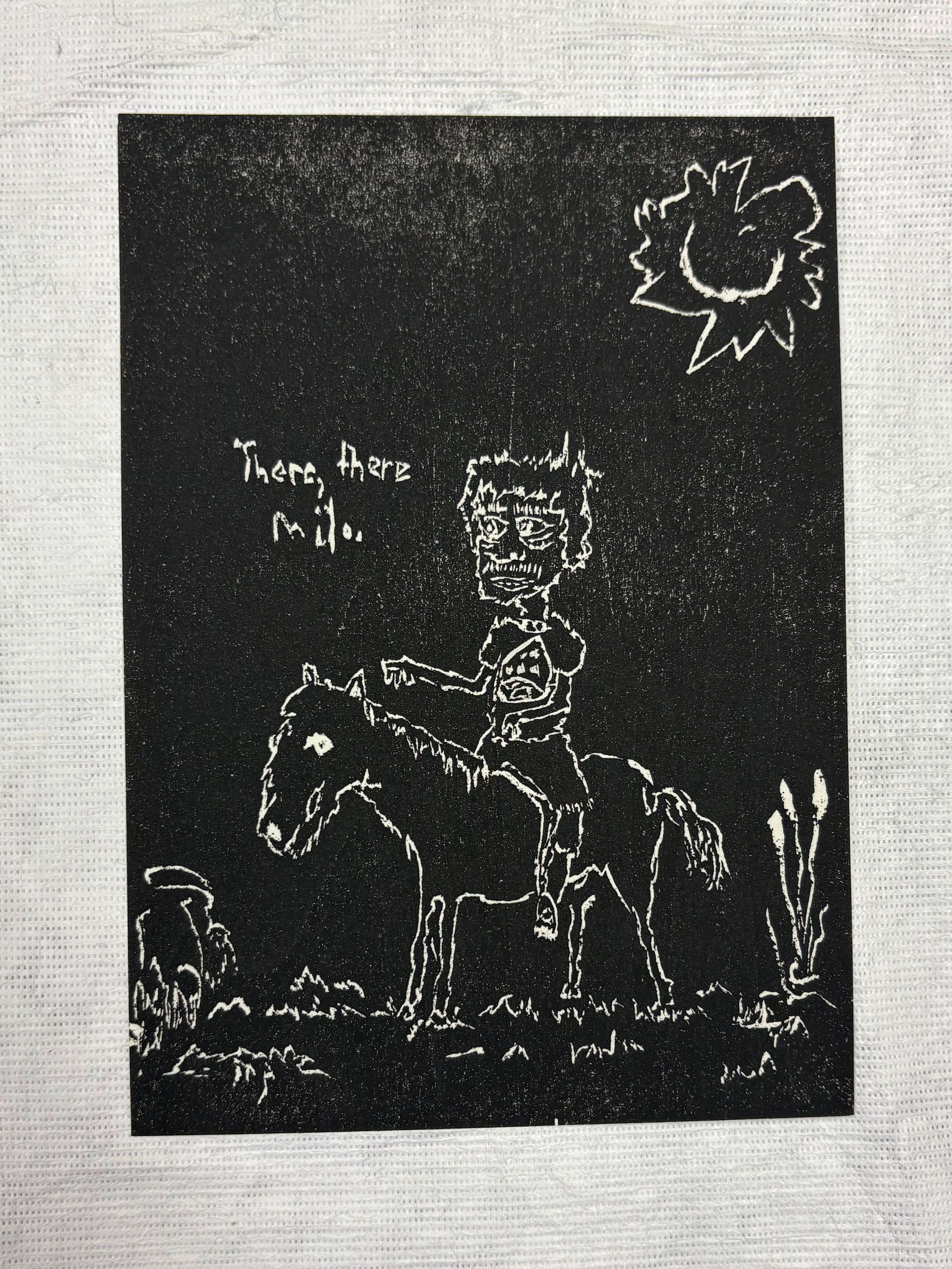 A small, vertically oriented print that is done on an off-white ground with black and white pigment. The print depicts an outdoor scene and at the center is a figure riding on top of a horse with text next to him.Collection