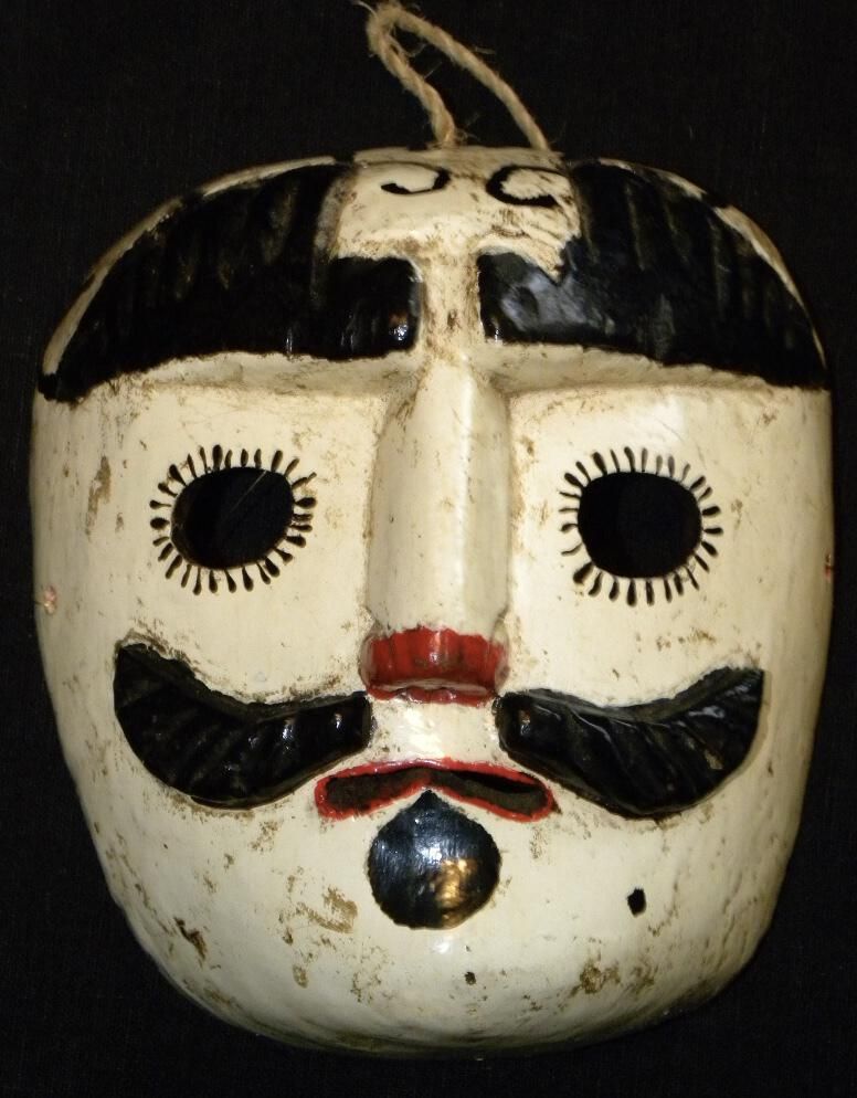 A small square wood mask depicting a man with a white face. Two circular cutout eyeholes are outlined with black painted lashes and under large, geometric black eyebrows. A red-tipped straight nose is above a thick parted black mustache. The red mouth is parted and above a teardrop-shaped black goatee. A wire and string are attached to the back of the mouth. Some signs of paint loss and chipping.Context