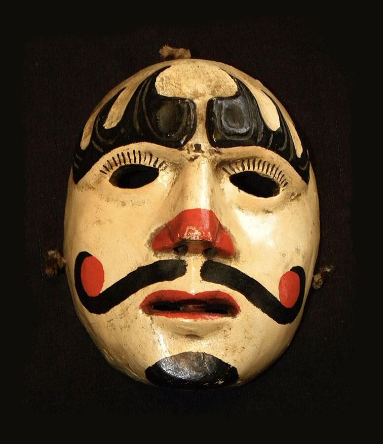 A life-sized oval wood mask depicting a man with a white face. Two cutout eyeholes are under black painted eyelashes and large, curling eyebrows. A straight nose with a red tip is above a painted black mustache that curls around red cheek circles. The mouth is red and slightly open. The chin has a black goatee. A wire and rope are attached to the back of the mask. Overall cracks and paint loss.Context