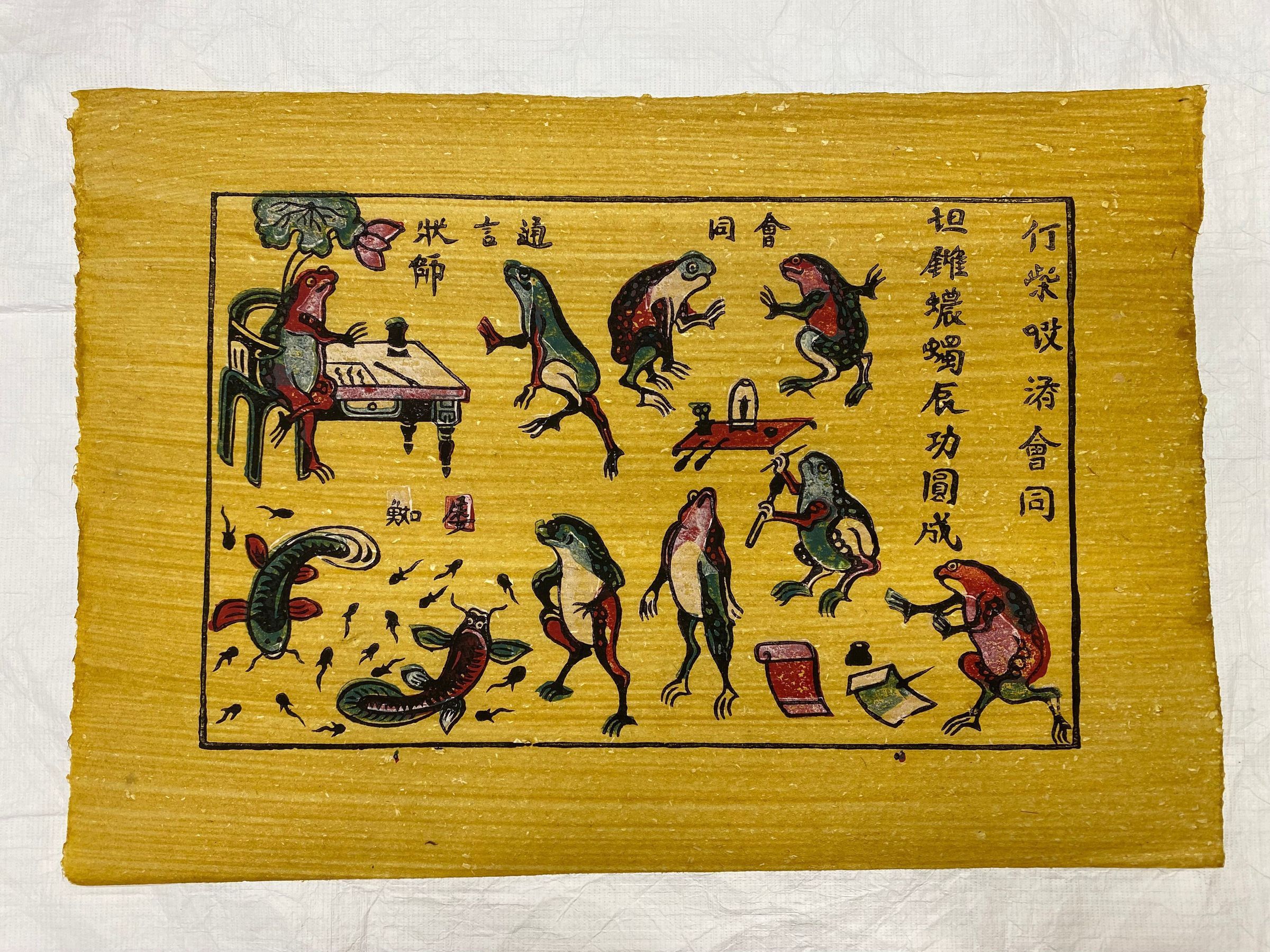 Traditional Vietnamese folk woodblock print on plant fibrous paper horizontally depicts the story of the frog teacher. From left to right this story illustrates a series of frogs engaging human-like in studious activities such as reading and writing or watching as fish swim with tadpoles.